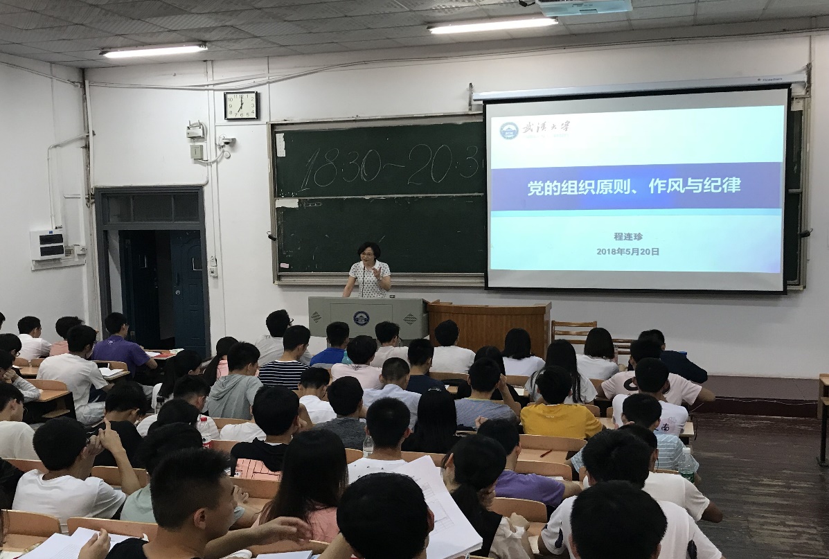 最后,程书记通过《中国共产党章程》介绍了党的纪律的主要内容,结合十八大以来全面从严治党成绩单和党的十九大报告,用一个个鲜活的数字和实例让同学们深切体会到了我们党“老虎苍蝇一起打”的力度之大,生动地阐明了党的六大纪律的含义和重要性。