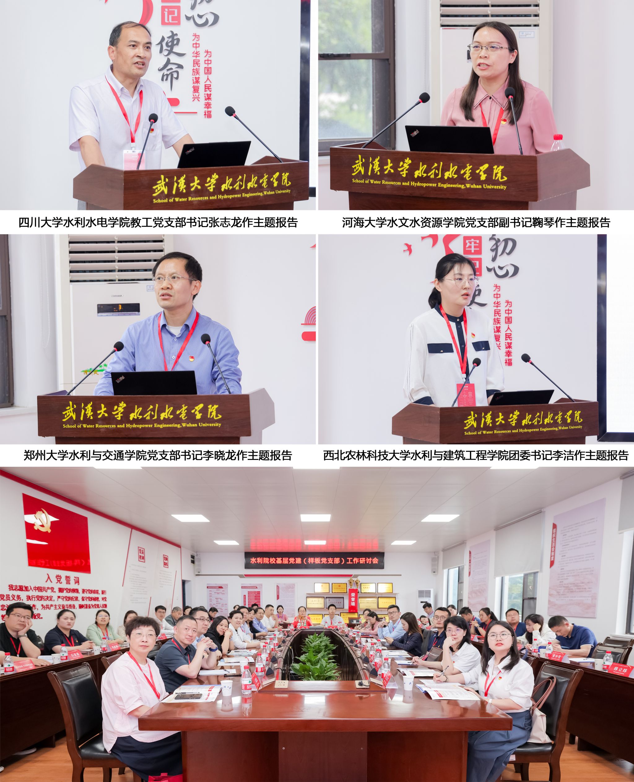 教师党支部书记程磊分别围绕党建“双创”提质增效的探索实践、教工党支部的创新实践、“一融双高”培养水利拔尖人才的策略进行分享,探讨了党建与业务协同推进的具体措施。姜明敏从知、行、悟三个角度出发,介绍了学院在精准党建定位和打造双创实践样本方面的做法成效及加强党建育人功能的思考。作为全国双带头人工作室党支部书记,马超教授分享了教工党支部工作和学习的创新举措。四川大学张志龙、河海大学鞠琴、郑州大学李晓龙、西北农林科技大学李洁等基层党支部书记展示了支部层面党建工作的创新实践,特别是在学科发展与人才培养中的积极作用。鞠琴展示了支部建设过程中总结凝练的五“航”五“聚”工作法,致力于成为教书育人的坚实战斗堡垒。李晓龙提出以支部党建助推人才与学科发展,分享了支部建设的亮点工作与突出成绩。