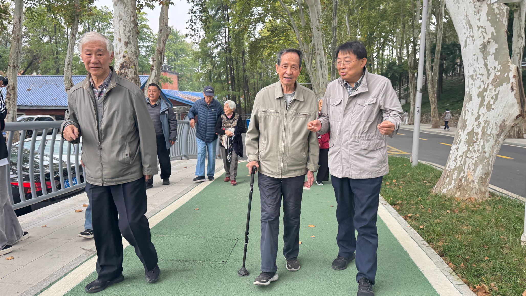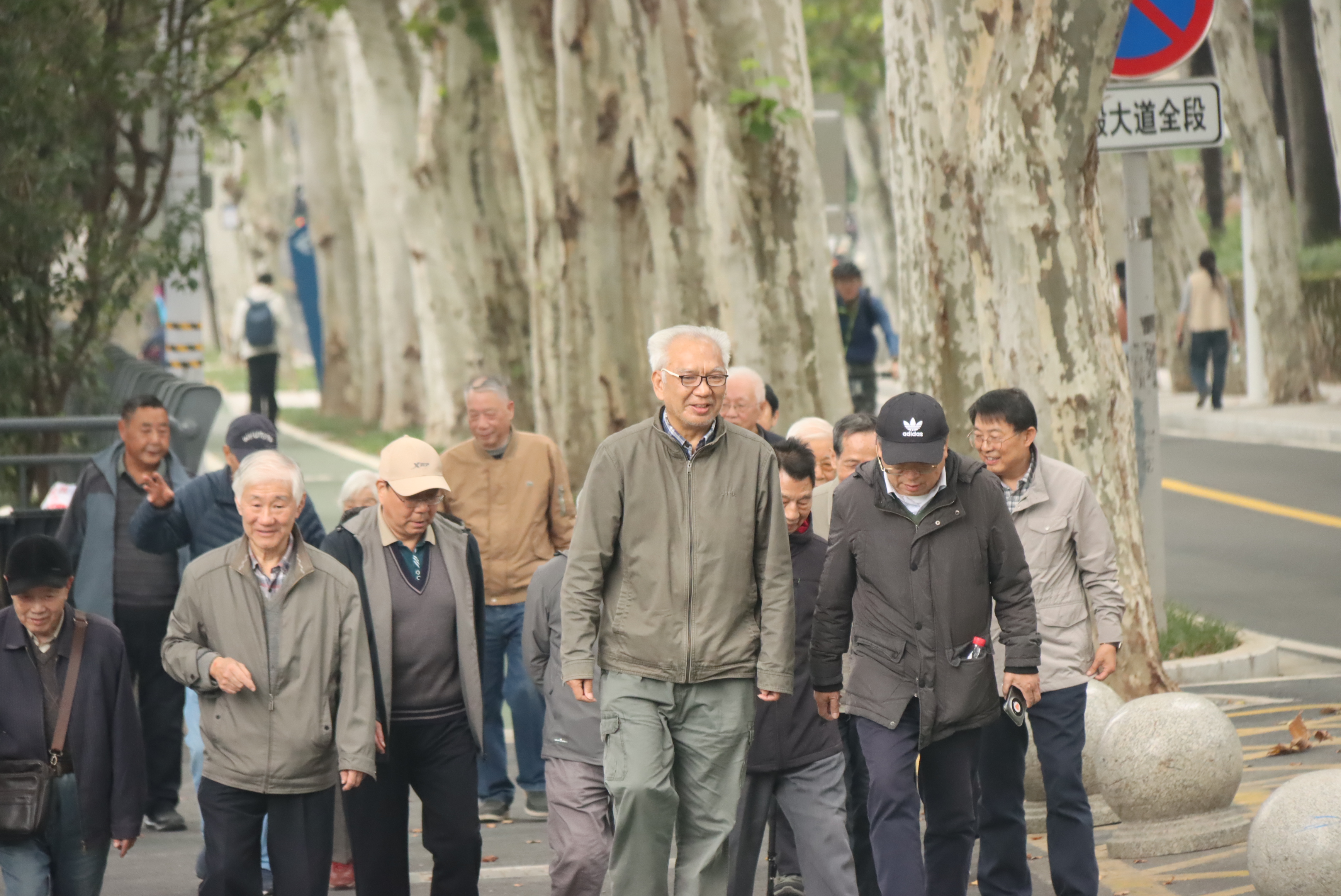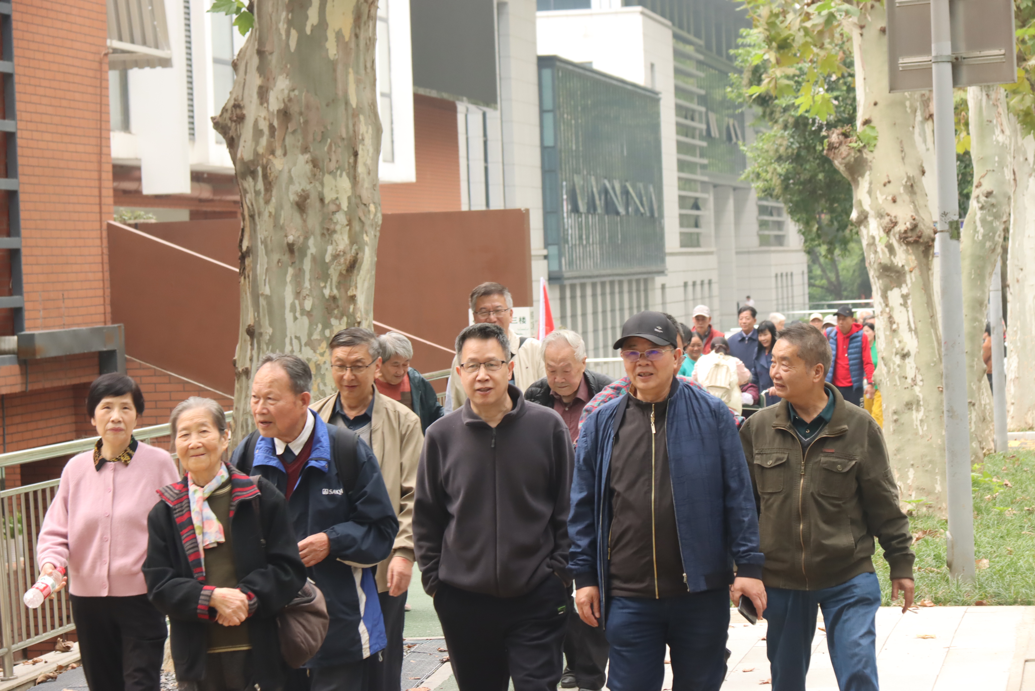 大会结束后,全体与会人员精神抖擞地参加了重阳登高活动。队伍从新水电科技大楼前出发,沿弘毅大道一路向上,途经工学部网球场、五教、六教后折返。秋日校园层林尽染,景色宜人。老同志们步履轻快,或驻足赏景,或并肩畅谈生活趣事,一路欢声笑语,洋溢着健康、乐观、向上的精神风貌。