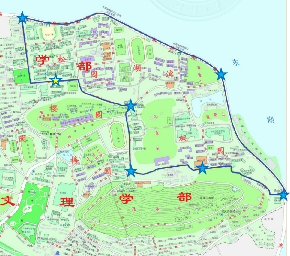 八教院子——文澜门——东湖绿道——扬波门(东门,一棵树)——学校行政楼——人文馆——八教院子。