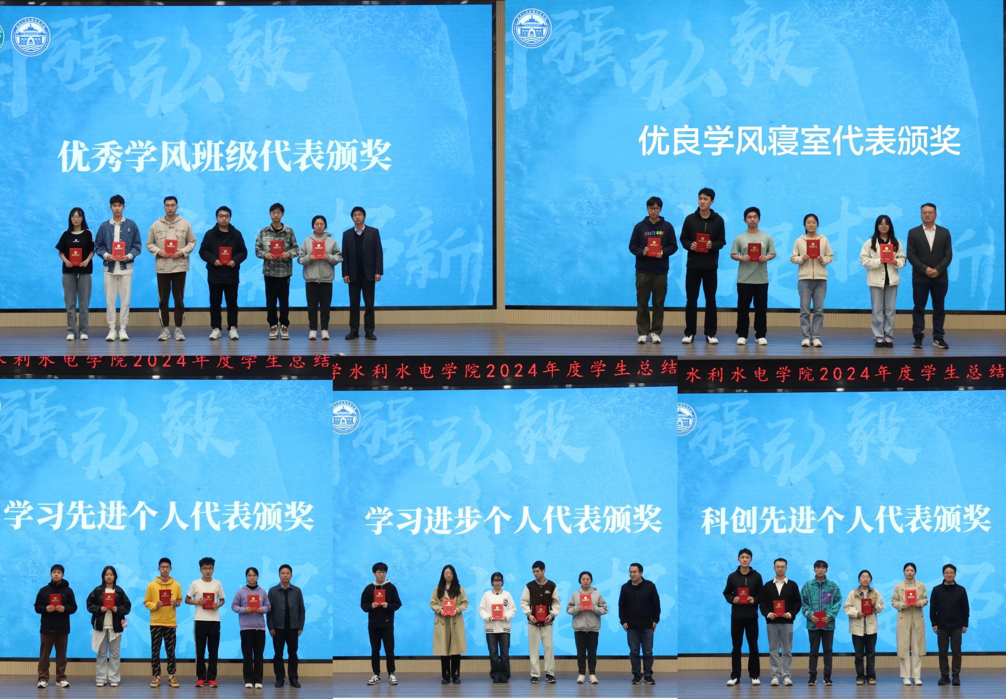 马刚宣读了学习和科创竞赛表彰文件。本年度学院共有6个优良学风班级、11个优良学风寝室、120位学习先进个人、26位学习进步个人、66位课外学术科技创新活动先进个人受到表彰。水力发电工程系第一党支部书记胡冉、水文水资源系党支部书记程磊、河流工程系党支部书记李志威、水利工程系党支部书记查元源、智慧水利系副主任王顺分别为获奖集体和个人代表颁奖。
