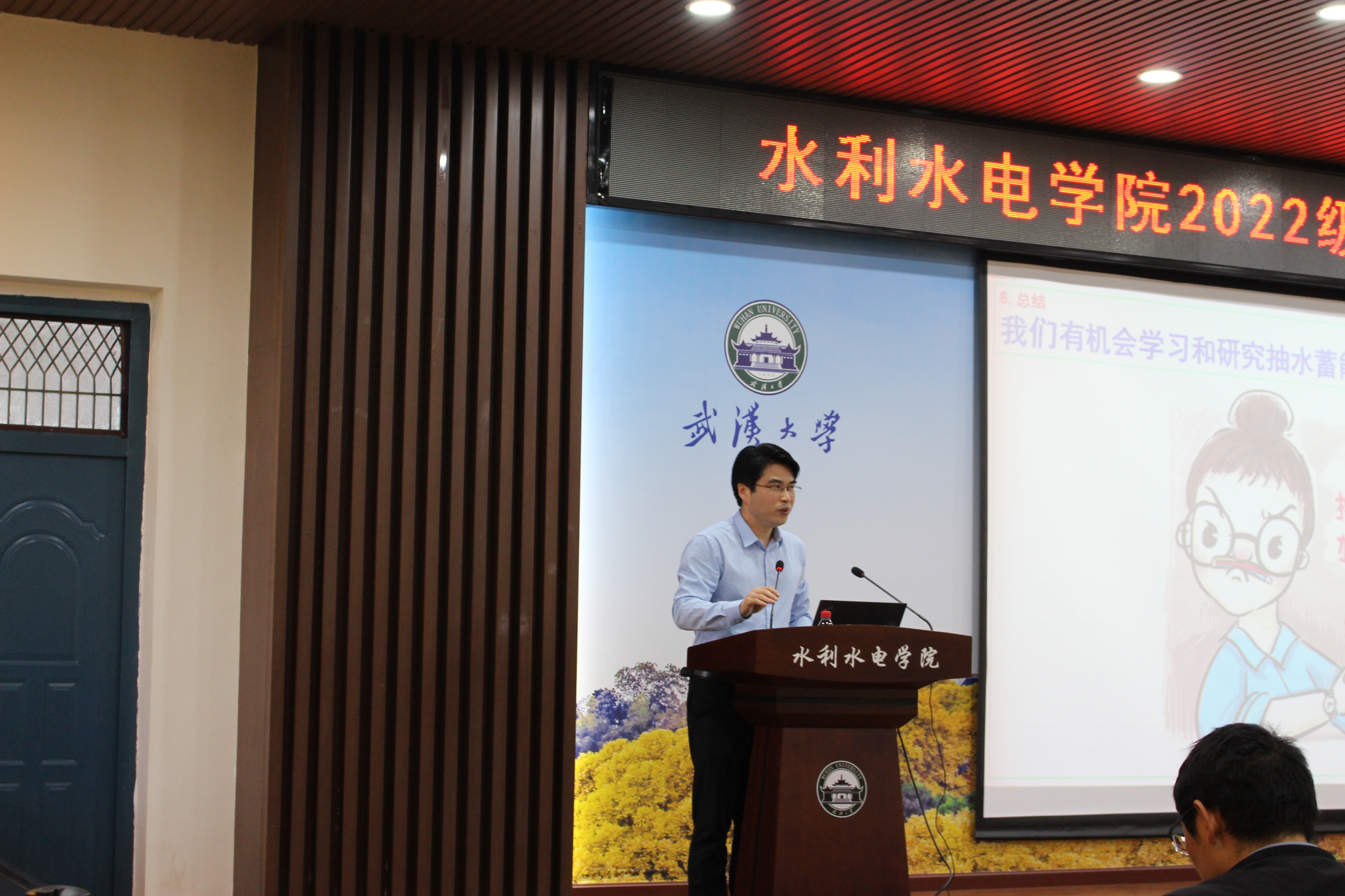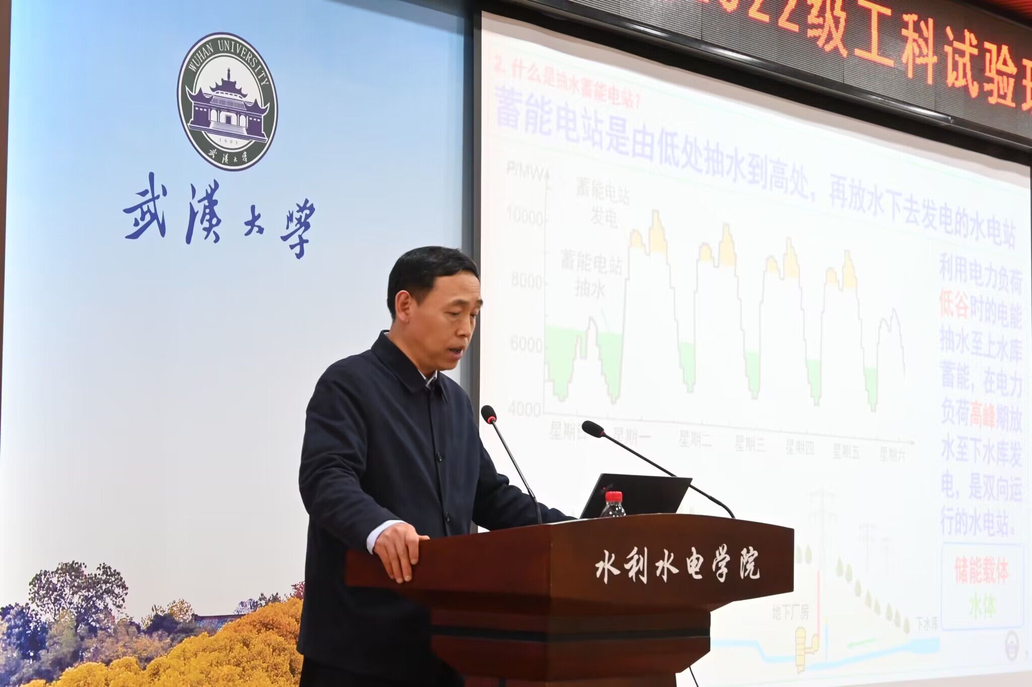程永光教授以《抽水蓄能技术:我国双碳目标的重要保障》为题,用幽默风趣的语言将抽水蓄能技术比喻为“超级充电宝”,将专业知识生动形象地传授给了同学们,激发了同学们对水电工程的兴趣。他多次强调:“国家的需求就是我们奋斗的方向”、“愿和同学们一起学习新知识和新技术”,最后号召同学们:“我们赶上了好时代,要撸起袖子加油干!”