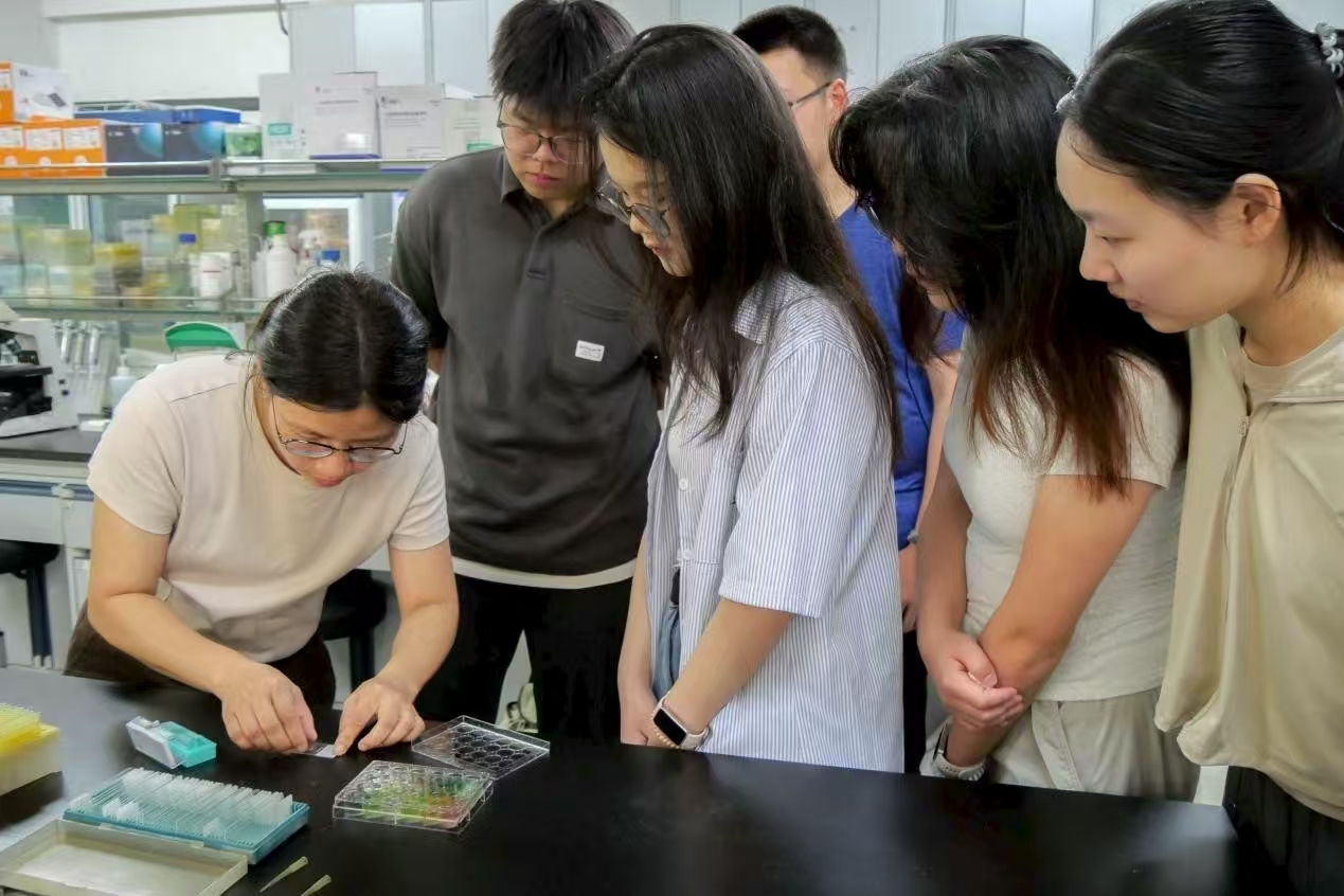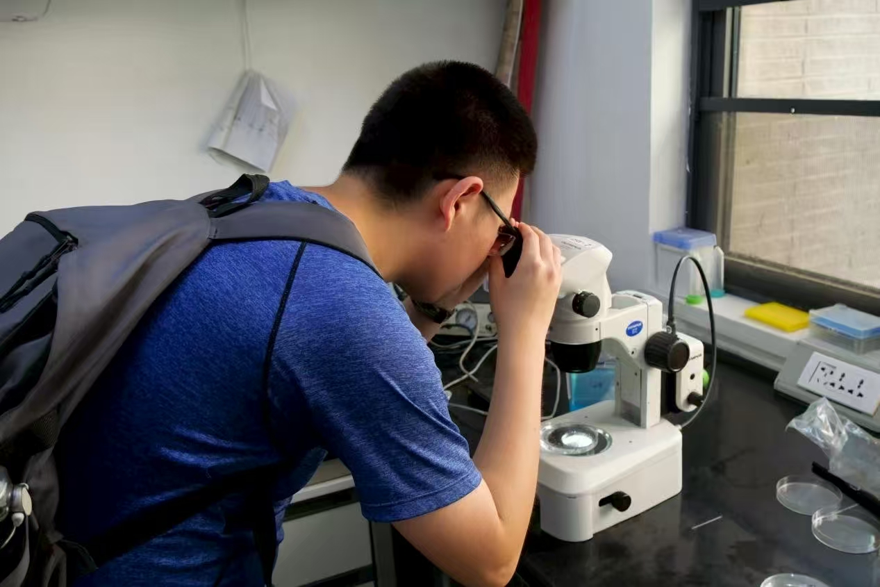 随后,实践队来到斑马鱼培育中心进行参观。在这里,队员们观察到了斑马鱼从胚胎到成体的完整发育过程,了解到中心采用基因编辑技术培育实验用斑马鱼,并通过二维码信息系统管理科研数据。黄色雄鱼与蓝色雌鱼的鲜明对比,让队员们直观感受到生命科学的奇妙。