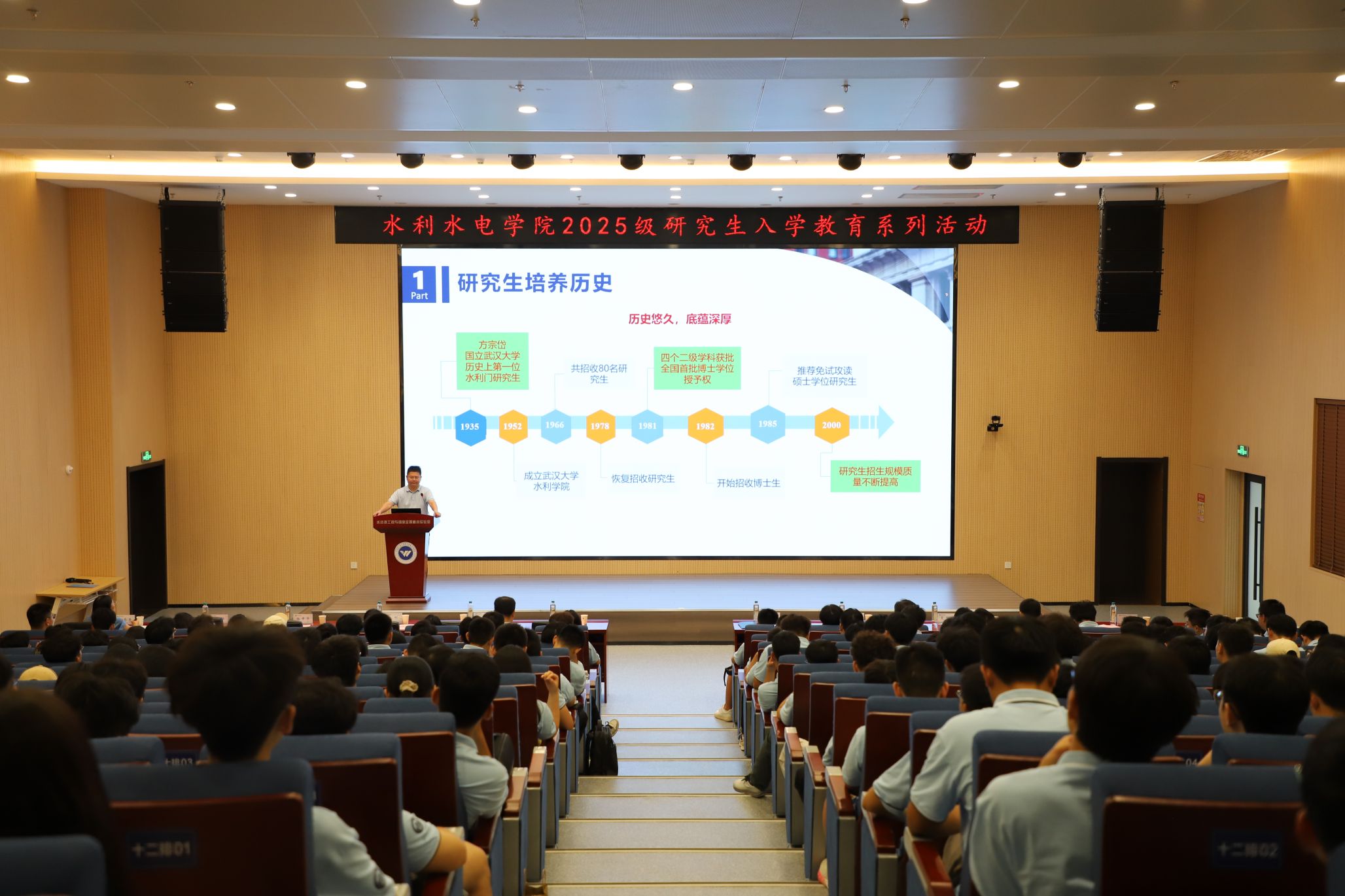 9月5日,学院2025级研究生新生见面会在水电科技大楼B109报告厅举行。学院党委书记、全国重点实验室主任李典庆,院长刘攀,党委副书记于敏、左志香,副院长伍靖伟、夏军强、杜文琪、马刚(挂职),各系书记、主任,研究生教学秘书、专兼职辅导员以及2025级研究生新生参会,会议由左志香主持。