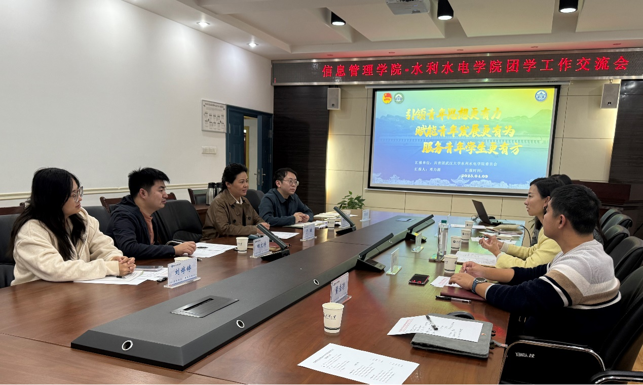 于敏对信息管理学院一行来访表示热烈欢迎,希望两院加强交流、共同进步。邓力源从引领力、组织力、服务力三个层面,介绍学院在团员青年思想引领、组织建设与服务育人等方面的工作,田文祥重点就科创项目的孵化培育和支持分享了经验,慈晓虎介绍了学生党员发展和培养相关工作。