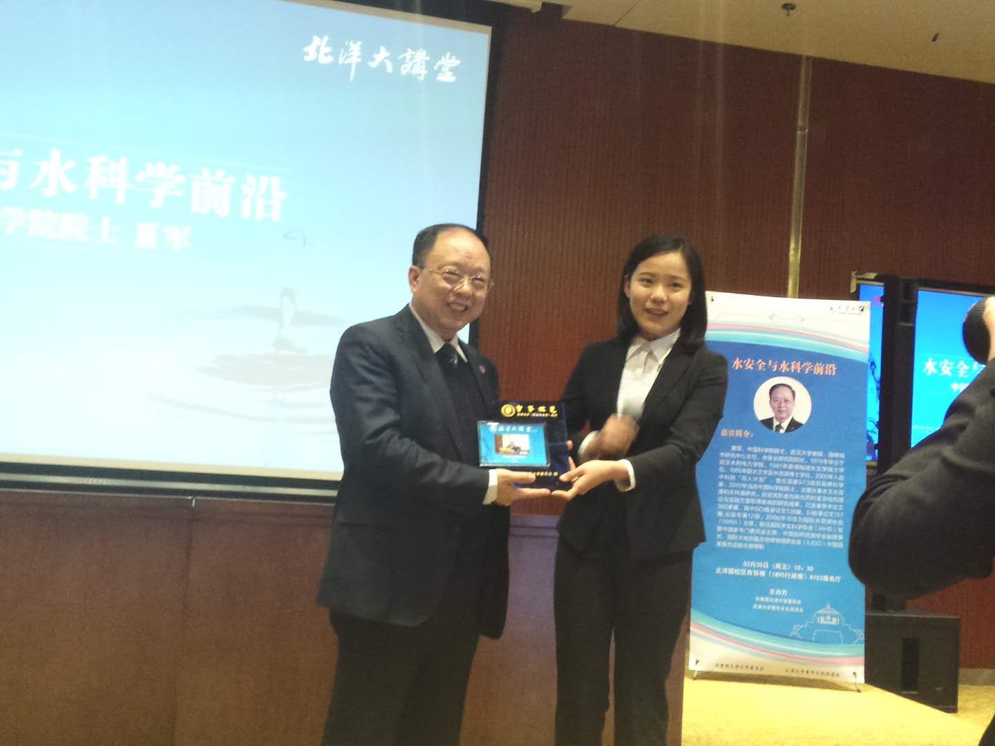 研讨会后,3月30日夏军院士受天津大学特邀做客北洋大讲堂,作了题为“水安全与水科学前沿”的学术讲座。夏军院士关注全球水安全的问题,着眼于我国目前严峻的水资源态势,重点讲解变化环境下与此相关的水科学体系,同时将水科学与国家 “一带一路”倡议相联系,针对发展中国家的水安全与国际合作问题提出对策与建议。讲座结束后,同学们对相关问题进行了提问,夏军院士热情详尽地解答,与在场师生进行了充分的学术交流。