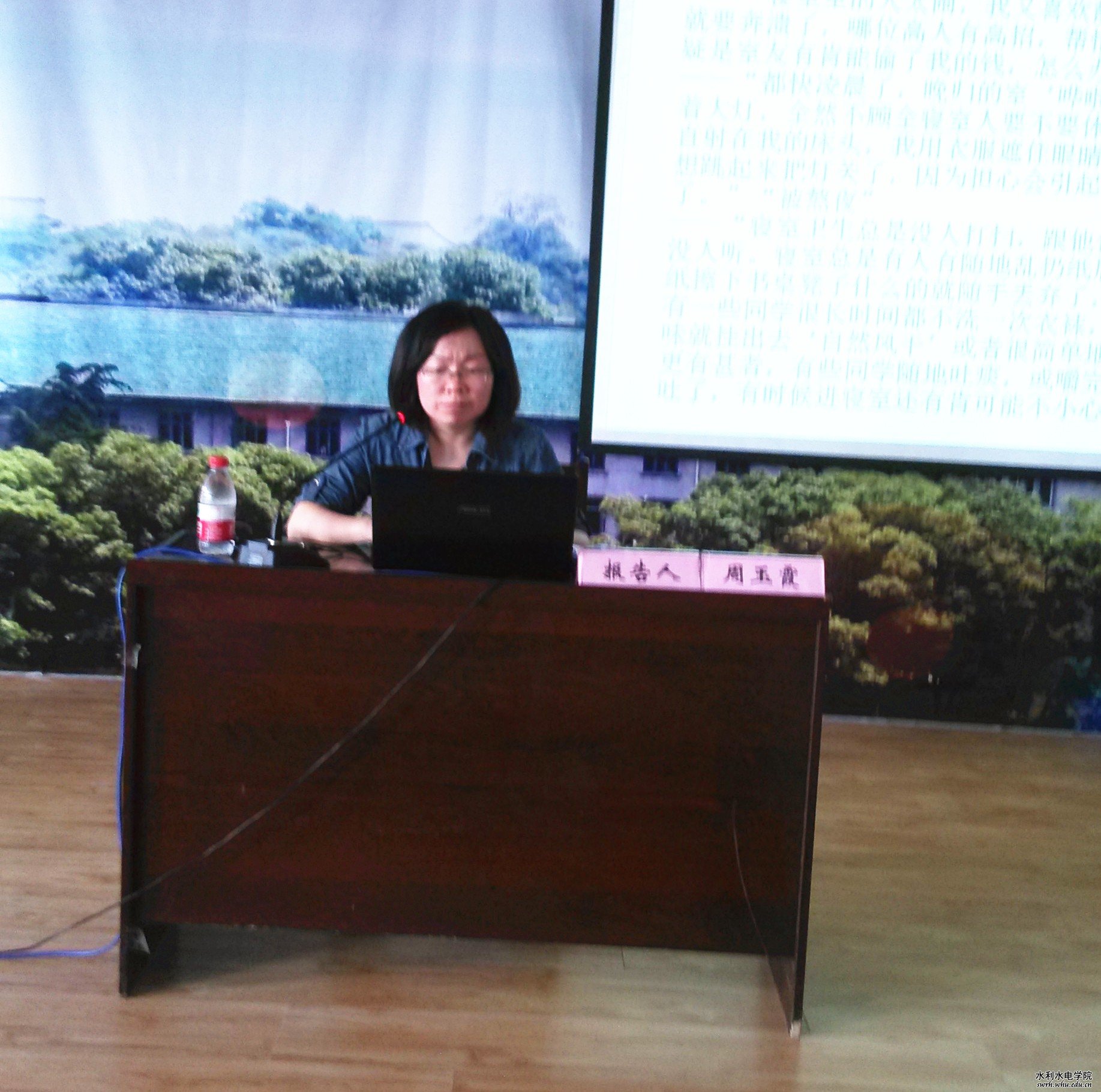 周玉霞作了题为《说说寝室的事》专题讲座。周书记告诉我们,处理人际关系要学会真诚、主动、宽容、平等,在寝室要讲寝室规矩,要加强寝室文化建设,充分发挥寝室对个人影响的正向功能,要从寝室长做起,开展丰富多彩,健康有益的寝室文化活动。只要我们都能做到这些,那么寝室的那些事都不再是难事。
