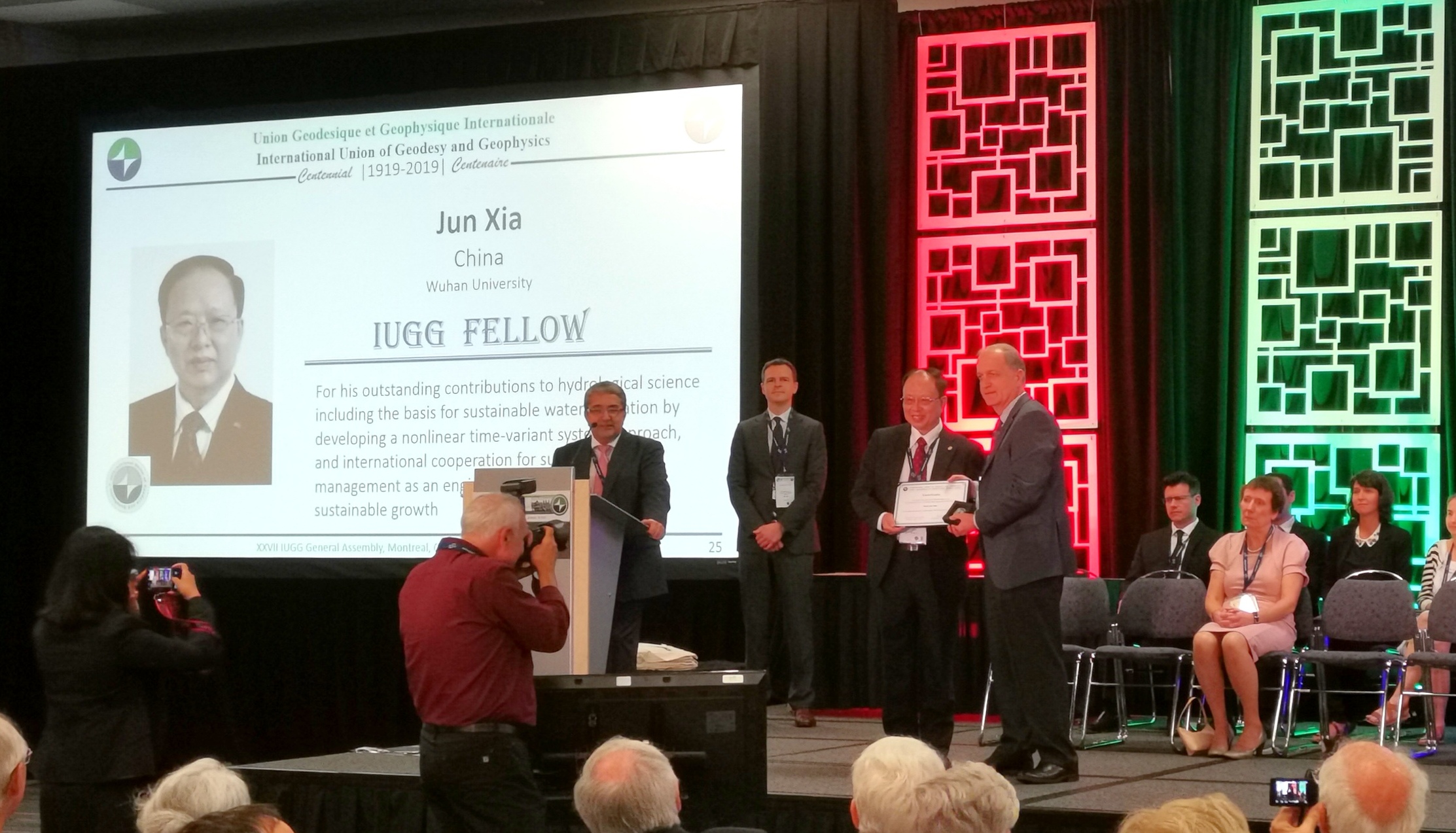 夏军教授,被授予全球地球科学领域最重要的学术荣誉:国际大地测量及地球物理学联合会会士(IUGG Fellow)。IUGG主席为他颁发了IUGG Fellow荣誉证书和奖牌。该荣誉每四年选举一次,2019年正逢IUGG成立一百年周年之际,意义非凡,夏军院士是今年全球通过选举获此特荣的7名科学家之一。