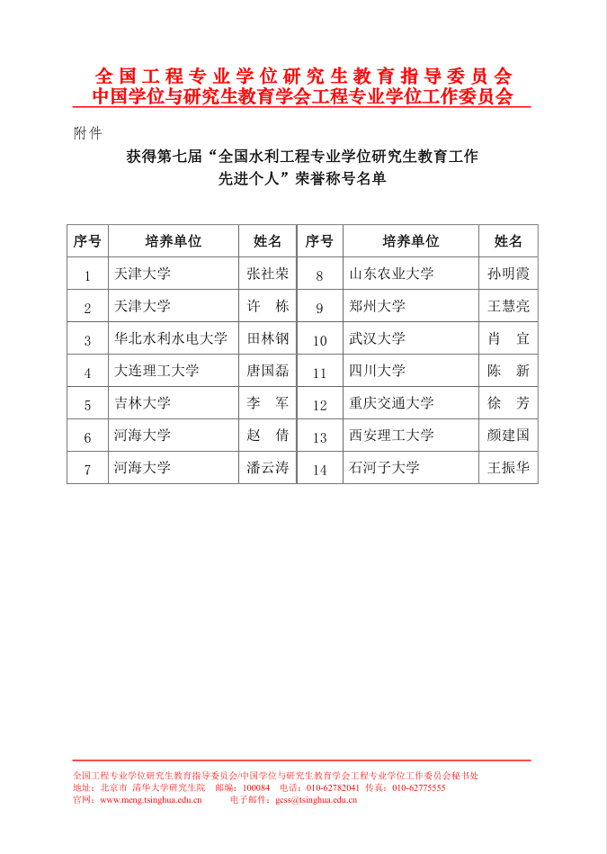 文件公布了18名 “全国水利工程专业学位研究生优秀指导教师”、14名“全国水利工程专业学位研究生教育先进个人”和12名“全国水利工程专业学位研究生实践优秀成果获得者”,其中我院共4名师生受到了表彰。伍靖伟、刘全2位老师荣获第三届“全国水利工程专业学位研究生优秀指导教师”;肖宜老师荣获第七届“全国水利工程专业学位研究生教育先进个人”;管光华老师指导的2017级专业学位硕士研究生钟稞同学荣获第四届“全国水利工程专业学位研究生实践优秀成果获得者”称号。