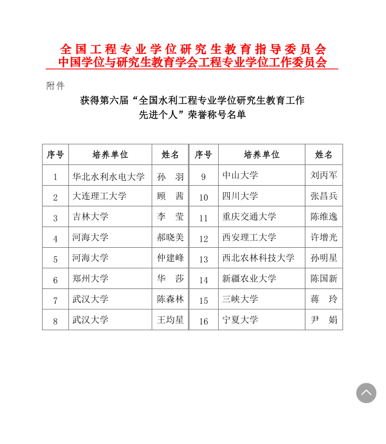 文件公布了16名 “全国水利工程专业学位研究生优秀指导教师”、20名“全国水利工程专业学位研究生教育先进个人”和16名“全国水利工程专业学位研究生实践优秀成果获得者”,其中我院共6名师生受到了表彰。杨国录、程永光和管光华3位老师荣获第二届“全国水利工程专业学位研究生优秀指导教师”;陈森林和王均星老师荣获第六届“全国水利工程专业学位研究生教育先进个人”;2016级专业学位硕士研究生胡诗怡同学荣获第四届“全国水利工程专业学位研究生实践优秀成果获得者”称号。