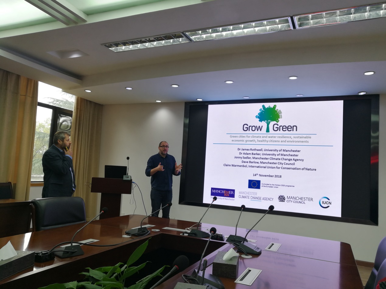 张翔教授对来访的一行专家表示了热烈欢迎,他从海绵城市研究中心的建设与发展、现有成果、“政、产、学、研、用”的多部门合作方式和我国目前关于绿色城市建设的相关政策等几个方面进行了介绍。James Rothwel和Adam Barker详细地阐释了GROW GREEN项目,并回顾了曼彻斯特大学在基于自然的城市建设发展策略等领域的工作与取得的成效。Simon Spooner介绍了阿特斯金在中国及全球的业务范围,并着重对公司在生态城市规划方面的技术专长及所参与的项目进行了展示。Claire Warmenbol简要的介绍了国际自然保护联盟在GROW GREEN项目中所起的作用。