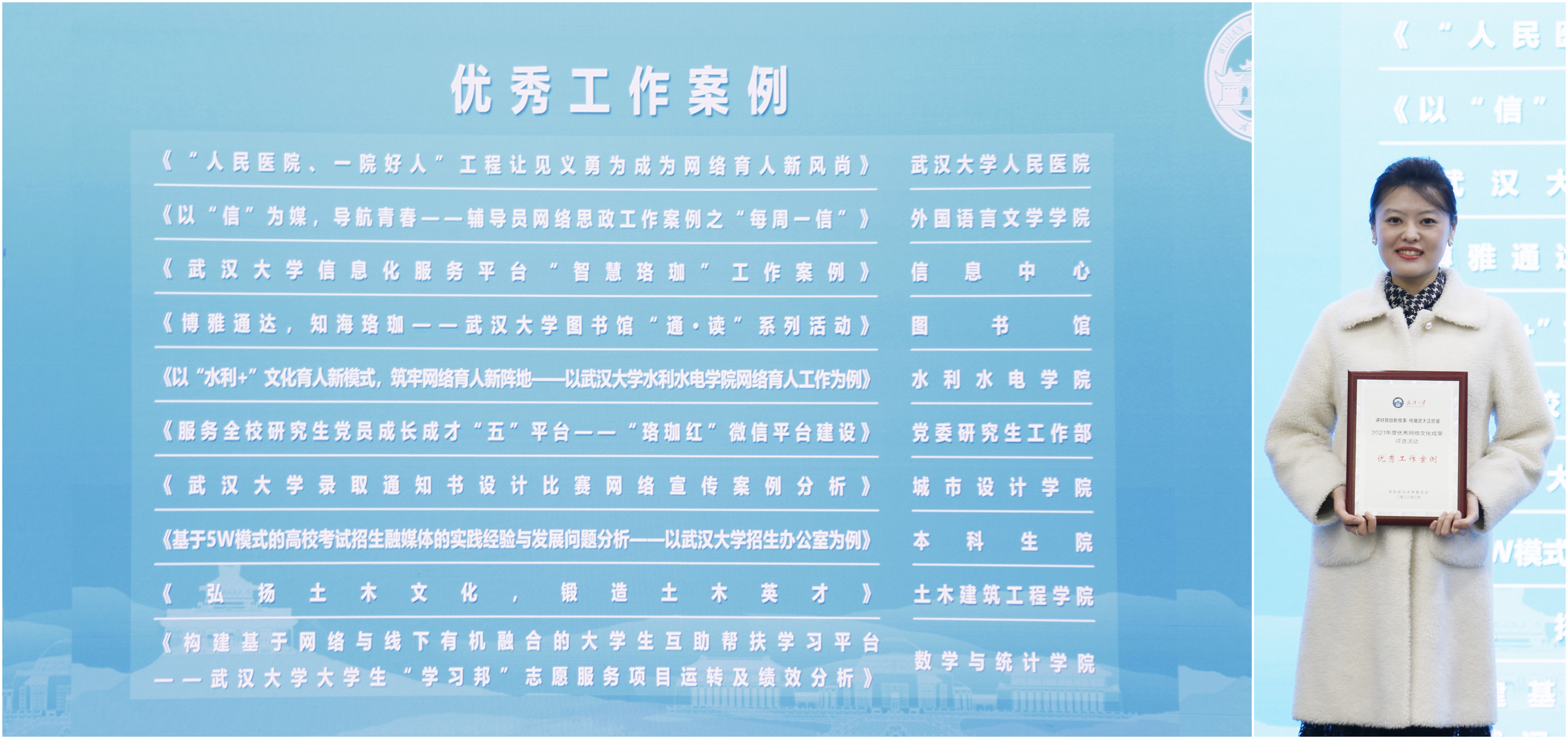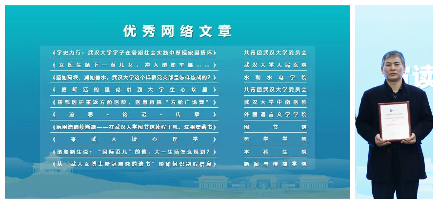 推荐的优秀网络文章、优秀工作案例各有1件作品获奖。校党委副书记沈壮海为我院获院获奖代表龚文德、刘嘉梅颁奖。