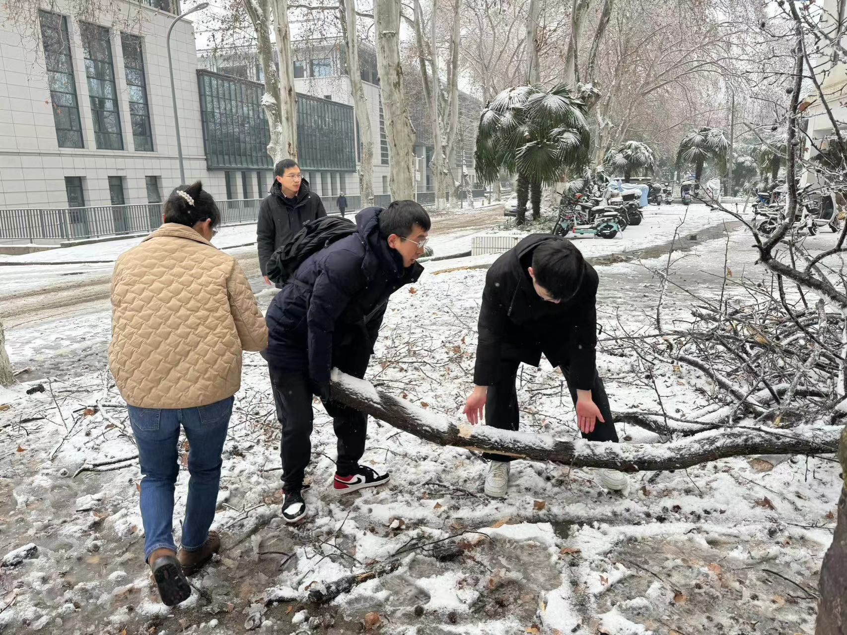 据悉,为充分应对2月3日以来的武汉低温雨雪冰冻天气,学院领导高度重视,迅速部署,及时调研学院、全国重点实验室周边道路情况,第一时间动员在岗行政人员、在校师生代表、物业工作人员等力量,清扫道路冰雪、路边断枝。学院分管安全保卫、后勤保障的副院长任春秀与工作人员一起及时清理断枝、快速打通学院周边人行通道。谢华、程怀玉、钱颖志等老师和在校研究生代表自发加入到清扫行动中。