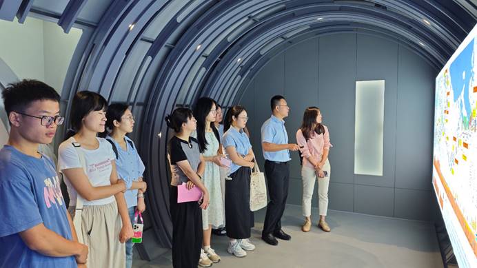 随后,实践队实地参观了环北工程D1标段施工现场,感受到环北工程的壮阔与技术的精细,对水利工程的规模性和复杂性有了更深刻的认识。项目负责人详细介绍了D1标段的施工情况,带领实践队参观盾构工作井和廉江泵站并讲解了其中的技术创新。目前施工现场也引入了无人机巡视和智能化监控,在后台大屏便可观察和管理所有地段的施工情况,令成员们深感震撼。