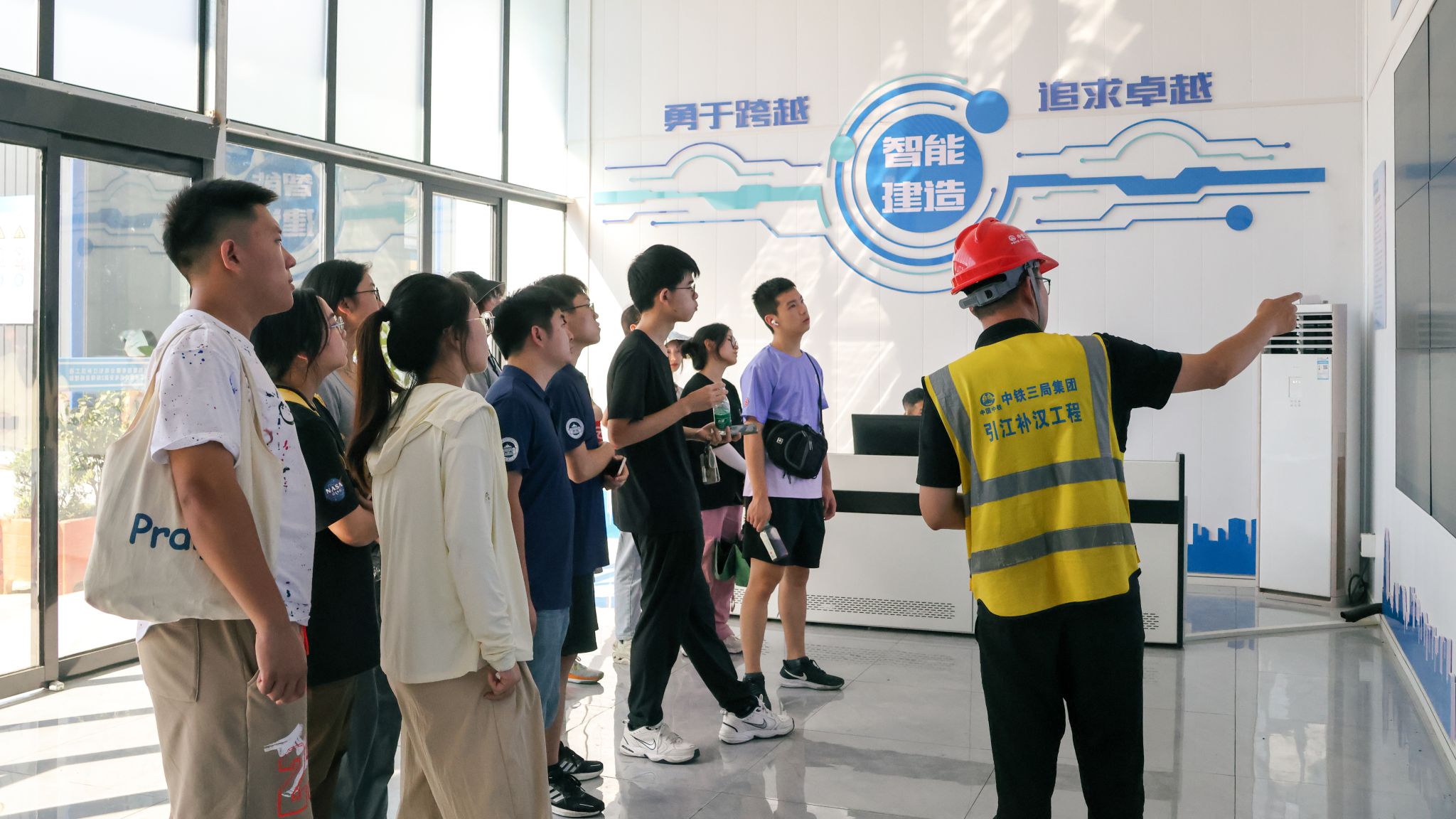 实践队沿长江穿汉水抵黄河,第一站抵达位于宜昌三峡库区的引江补汉工程取水口的一线工地,在现场技术人员带领下深入了解到引江补汉工程概况和输水隧洞入口的施工进展,其中武大硕士毕业生葛浩作为2024年入职江汉水网公司的新员工,谈及自己刚毕业即深度参与引江补汉工程感到非常荣幸,深觉使命重大。实践队还前往了中铁三局数字孪生智能建造中心,详细了解引江补汉工程的施工技术和难点痛点,中心专家们为实践队员们介绍了数字孪生技术在提高施工现场人员管理、原材料调配、生产安装全过程管控的高效性与先进性,大幅减少了人力成本,实现了资源的高效利用,解决了诸多技术难题。据了解同步推进的数字孪生水网系统,可强化水网的预报、预警、预演、预案功能,提升数字化、网络化、智能化水平,对于国家水网建设科学高效管理起着至关重要的作用。