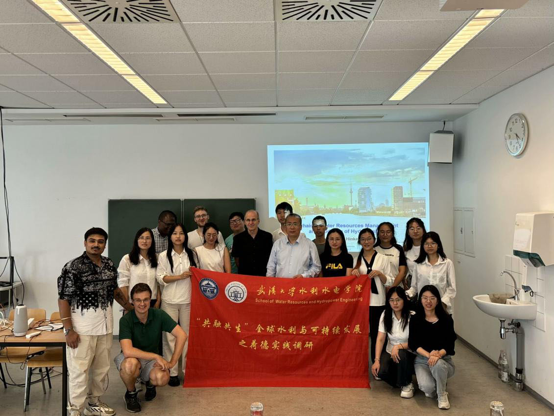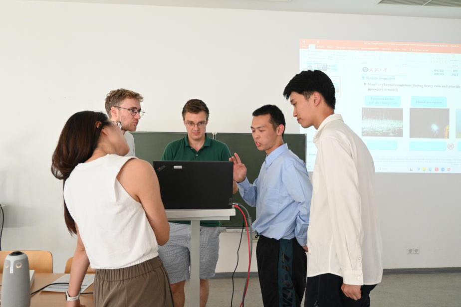 的基本情况及各自团队的研究项目及成果。在学生交流汇报中,实践队成员黄定武、周张驰小组介绍的 Underwater Eye( 可实时获取渠道水力参数的设备)引起了大家的兴趣,就该设备的精度、使用情景与改进措施进行了深入探讨。Hinkelmann教授团队的介绍则聚焦于城市水系统的管理,在提及管网系统物质传输模型时,实践队成员蔡珺就动力传输与对方进行了深入交流。大家畅所欲言,交流互鉴,队员们既拓宽了视野,也学习到了国外高校学生的思维方式与质疑精神,为未来的研究生涯积累经验。