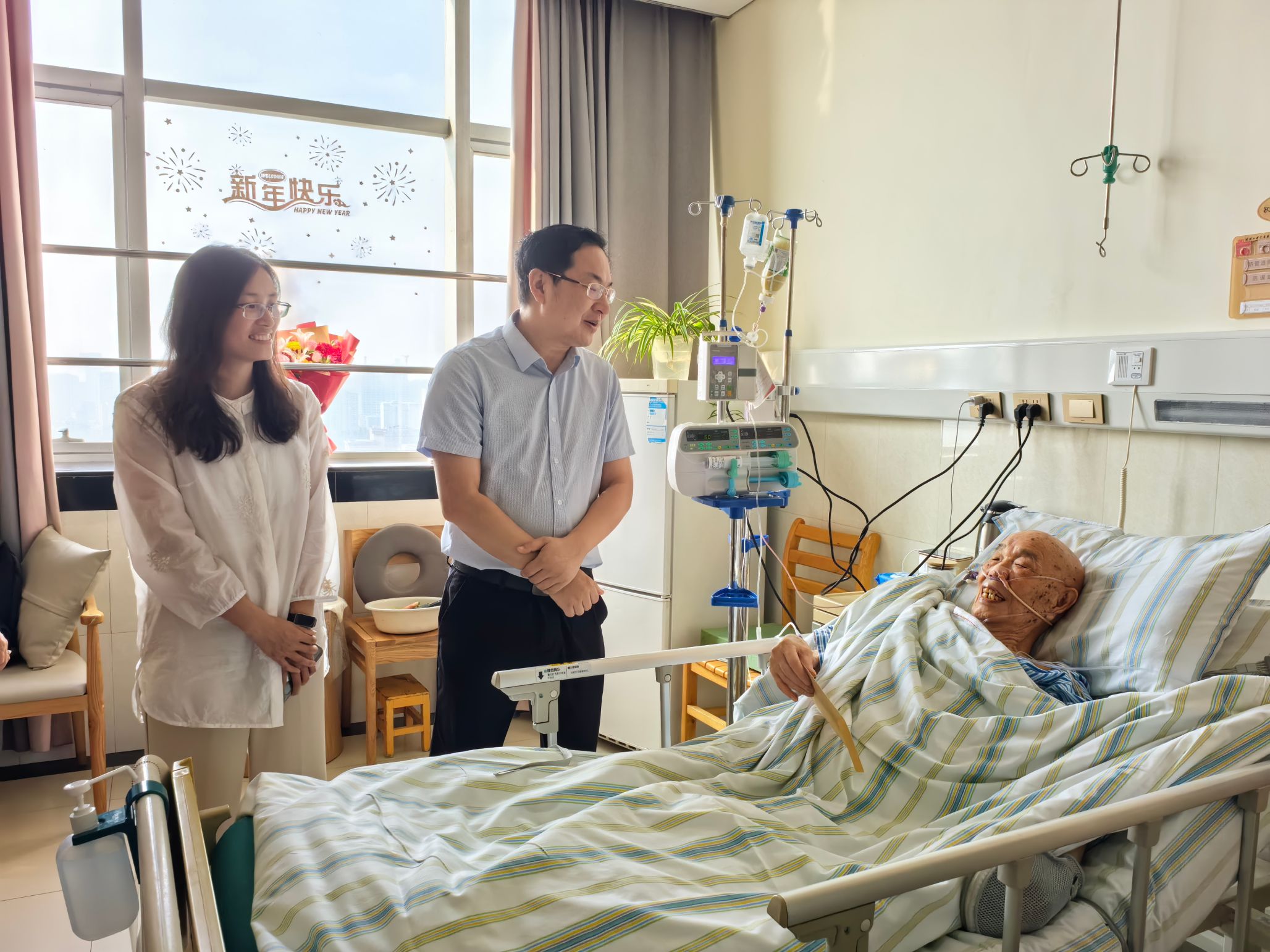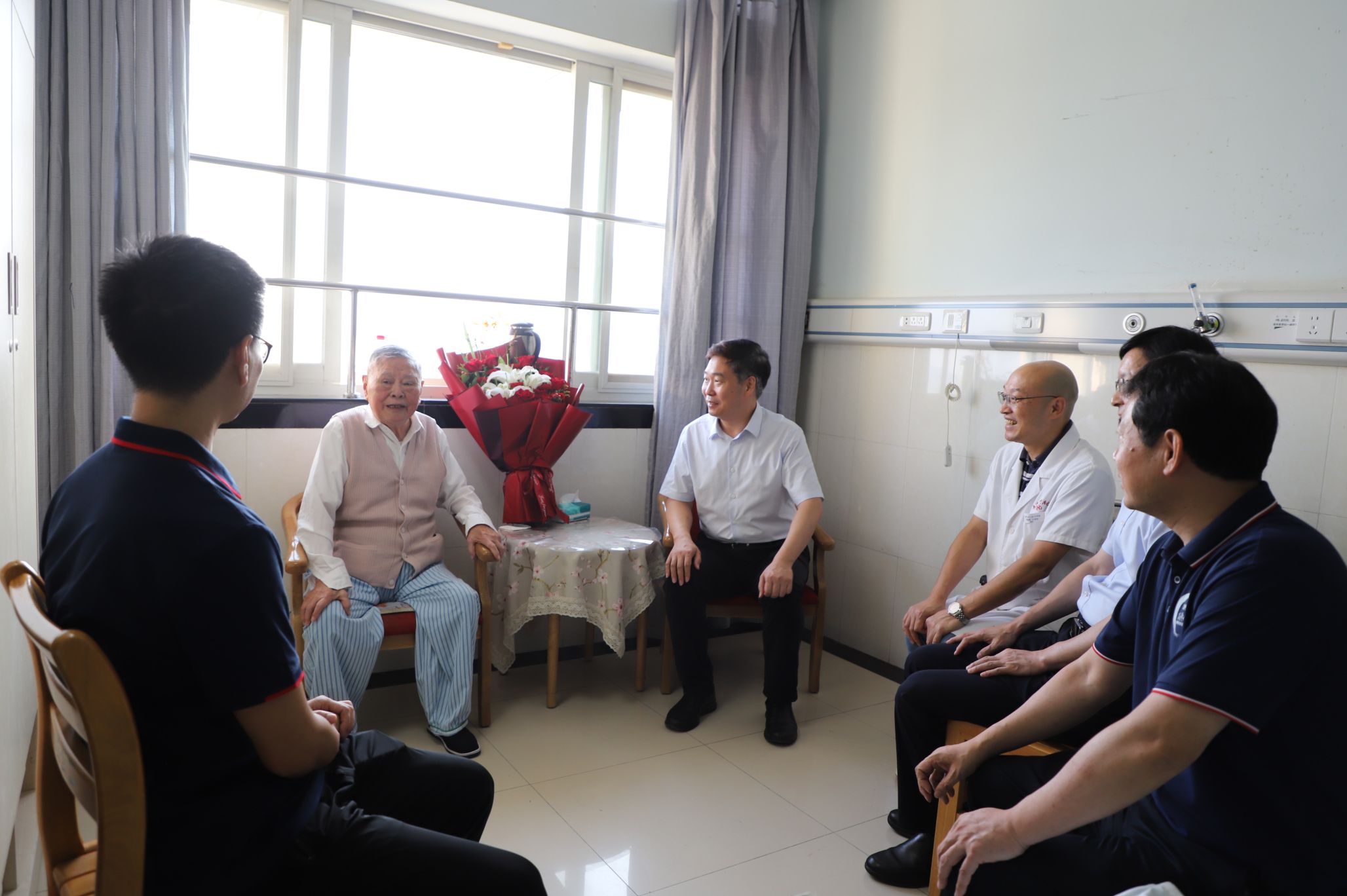 随后,领导一行又前往中南医院看望吴国栋老师,向吴老师致以诚挚的问候。现场,吴老师与大家频频握手,表达喜悦之意。刘攀表示,离退休教师是学院发展的重要基石,他们的智慧和经验是学院宝贵的财富,学院将一如既往地关心离退休教师的生活,让每一位老同志都能感受到学院大家庭的温暖。