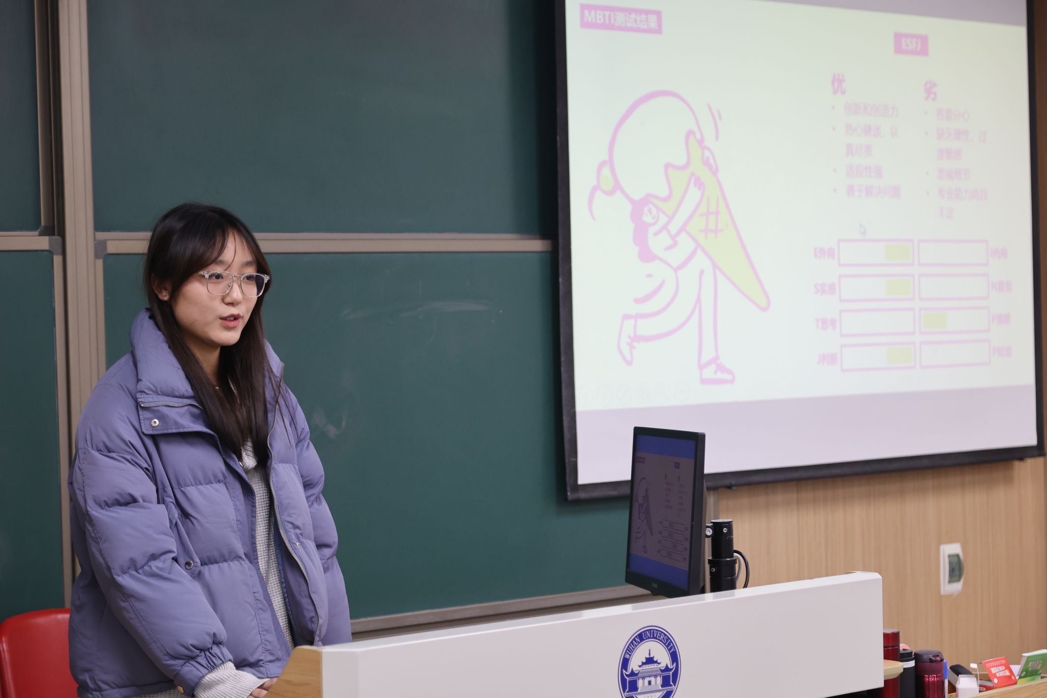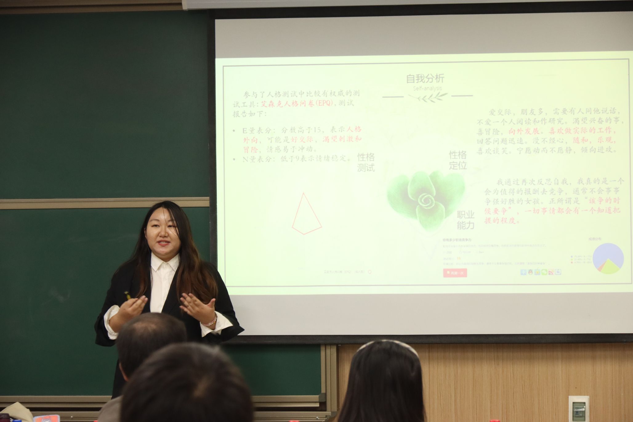首先进行就业赛道比赛,9名研究生分别进行了自我陈述与展示,并接受了评委的提问。在个人陈述环节,选手们围绕自己的职业目标、岗位胜任力、发展潜力等方面进行了阐述,详细介绍了自己在本科阶段和研究生阶段如何进行成长规划和未来的职业目标,结合未来拟从事的职业分析了自己的优势和不足,充分展现了同学们善用职业规划工具、善于提升自身能力。