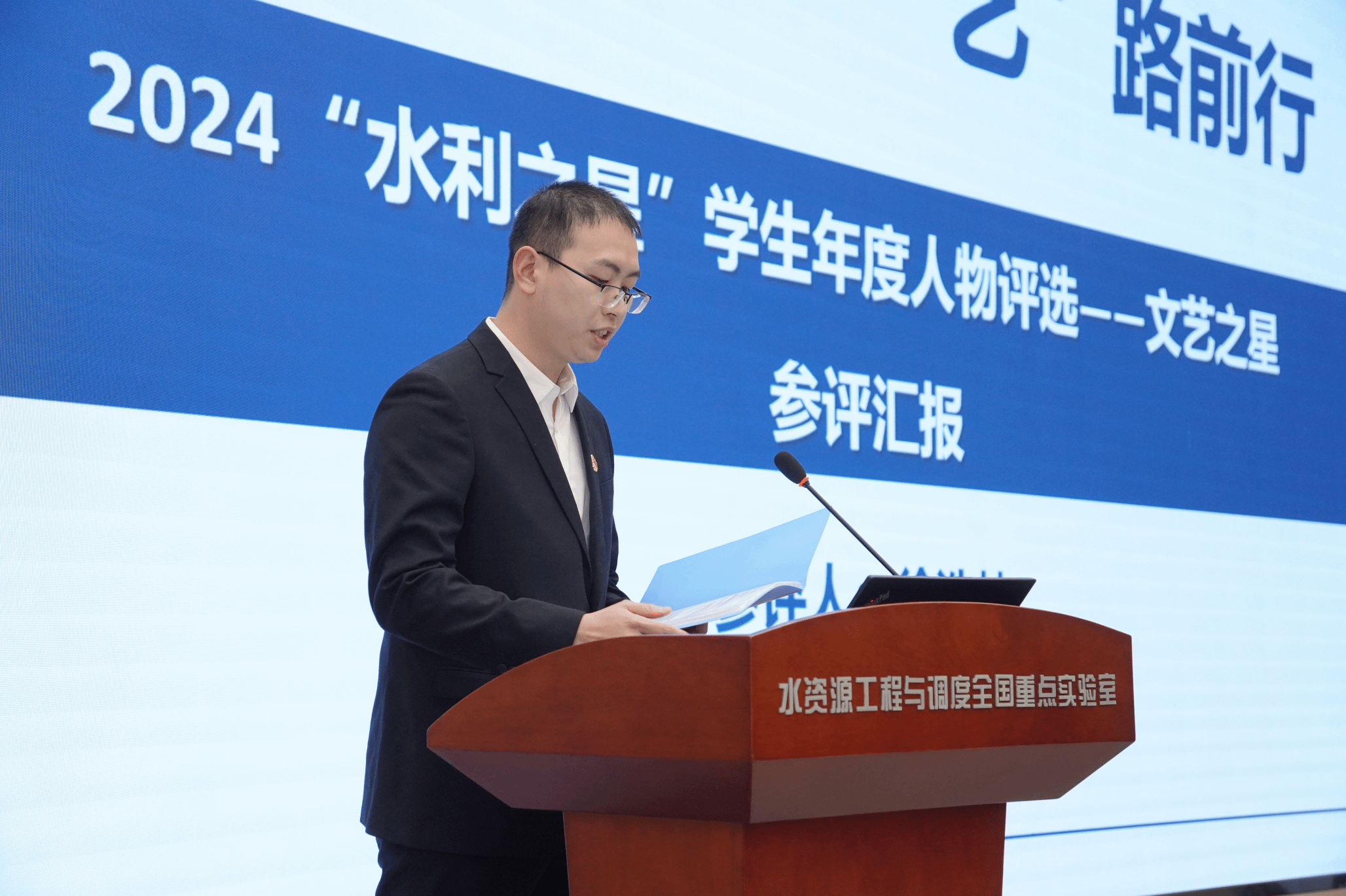 2024年“水利之星”学生年度人物评选答辩会。学院党委副书记于敏、左志香和学工办辅导员出席,19位候选人及团体代表依次上台答辩,展示了他们在各个领域中取得的代表性成果。