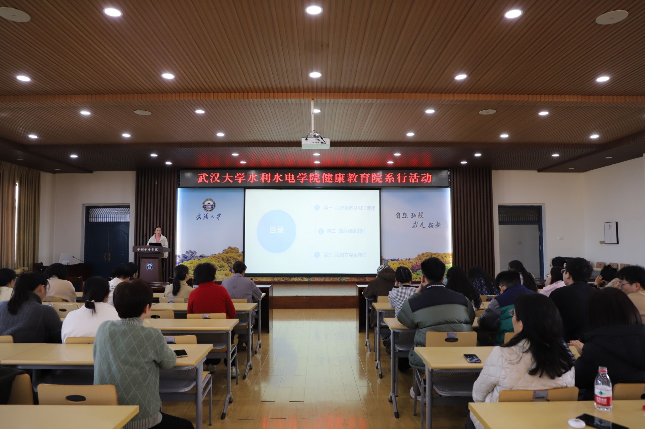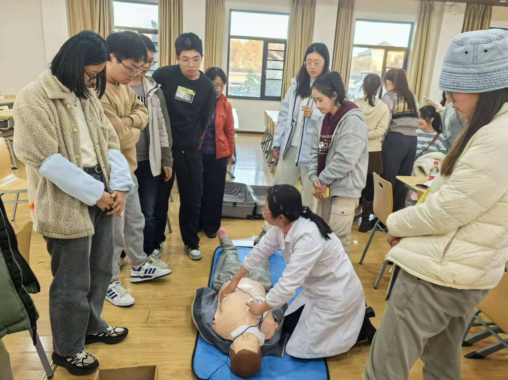 活动伊始,专题讲座精彩纷呈。校医院副院长黎明丽介绍了校医院近期在仪器设备和服务范畴方面的发展,阐述了教职工体检工作中发现的问题;工学部院区一门诊部主任杨柳讲授了生活中常用的急救方法;校医院中医与康复科主任李云鹏详细介绍讲授了中医冬季的各种养生知识。