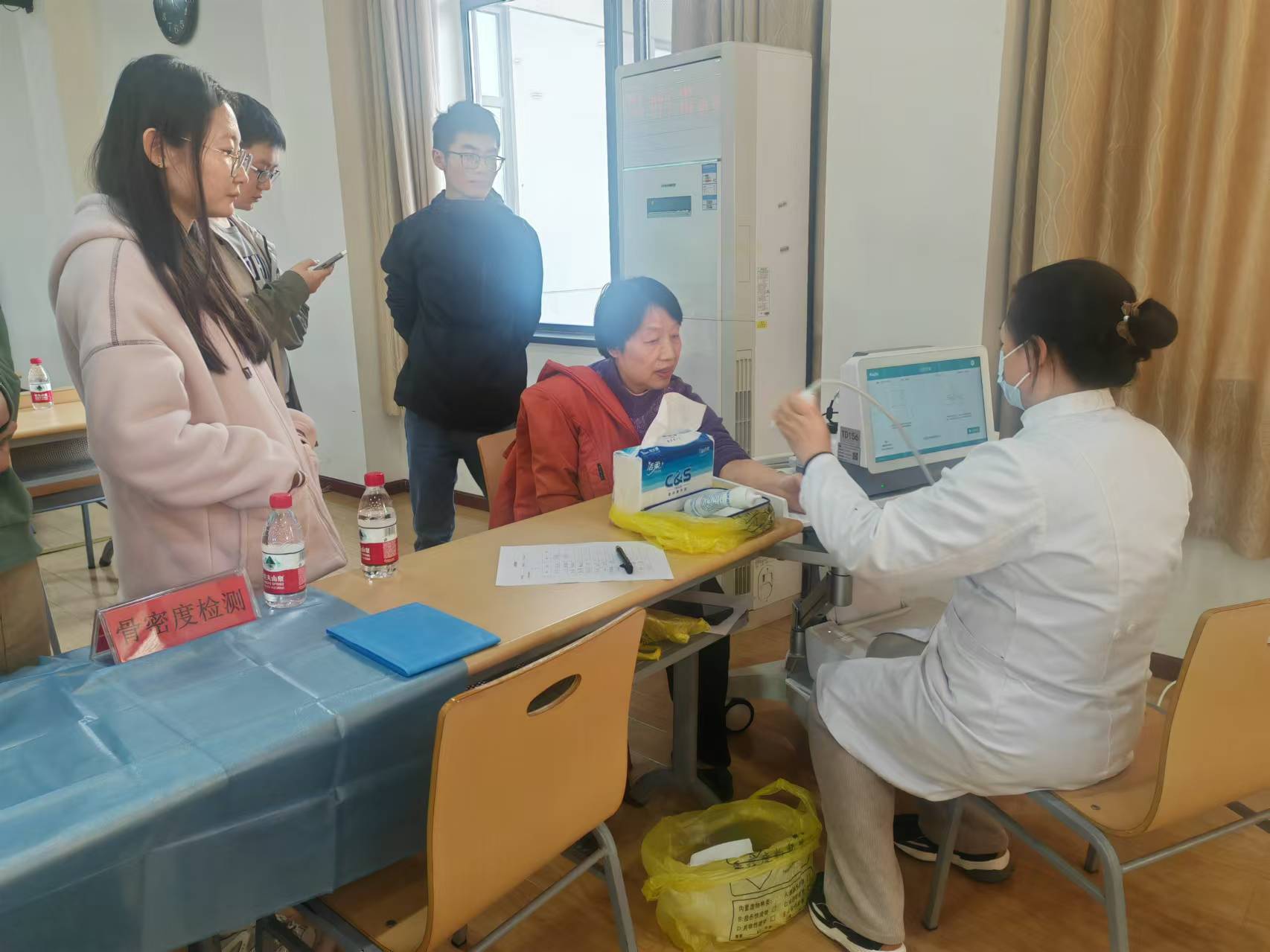 讲座介绍后,专家们现场为师生们进行了血压、糖化血红蛋白检测、乙肝抗体检测、骨密度检测及中医义诊等。义诊现场非常火爆,师生们纷纷排起了长队。“我一直都没能挂上李医生的中医号,没想到今天在学院看上了,太幸运了,这样的活动真好。”一位老师拿着李医生开具的处方开心的说到。“原来我的乙肝抗体已经弱阳性了呀,那我明天就去校医院接种加强针”一位老师感谢地对医生说道。