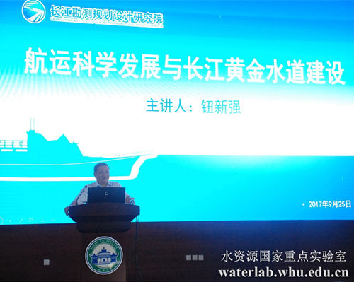 9月25日下午,中国工程院院士、长江勘测规划设计研究院钮新强院长做客珞珈讲坛第198讲,作题为“航运科学发展与长江黄金水道建设”的报告,常务副校长谈广鸣教授为其颁发珞珈讲坛纪念证书,水资源与水电工程科学国家重点实验室主任卢文波主持报告会。