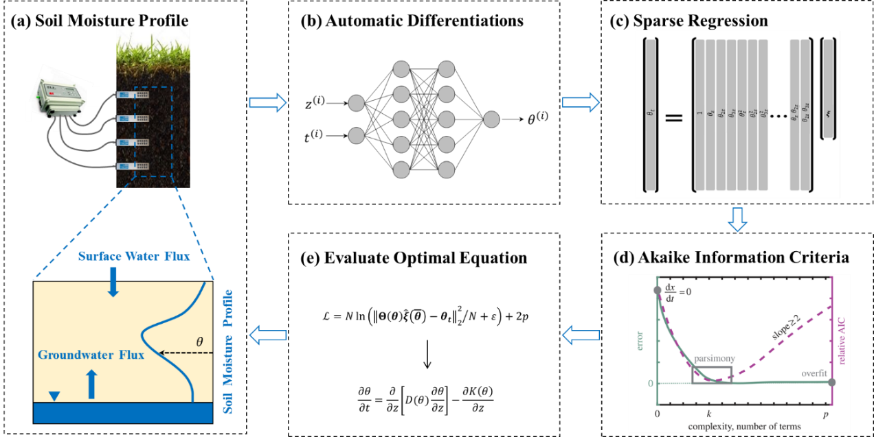 题为“Data-Driven Discovery of Soil Moisture Flow Governing Equation: A Sparse Regression Framework”的论文,聚焦于方程挖掘,这是高级人工智能所需解决的问题。在传统研究中,描述土壤水运动的方程由质量守恒与达西定律出发严格推导得到的。然而在许多实际问题中,这种建模方式具有结构误差大、调参成本高等缺点。针对该问题,研究提出了一种数据驱动的稀疏回归方法,能够从体积含水率的时序数据中挖掘得到土壤水运动控制方程,为土壤水运动的智能建模与物理规律挖掘提供了新的视角。研究团队利用线性近似的方法,将非线性回归问题转换为拟线性回归问题,以确定非线性系数;同时利用群体稀疏方法以及信息熵确定导数项所表示的土壤水运动物理过程。除了一些假设之外,该方法不需要任何先验信息,包括特定的本构关系模型、边界条件和初始条件。首次仅从体积含水量观测数据中,发现了与时间相关的非线性土壤水运动方程。