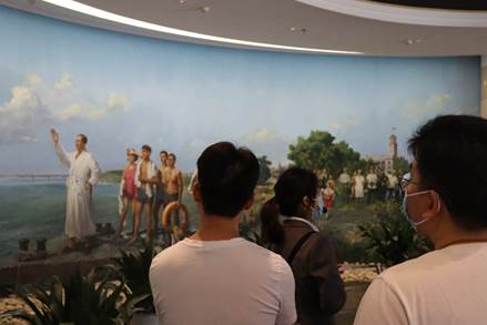 第二站,支部成员在鲁燕同志的带领下来到了横渡长江博物馆。武汉横渡长江博物馆采用苏式建筑风格设计,博物馆展示厅由序厅、主展示厅、体验厅、观景区等组成,展示内容包括“击水中流”、“情系长江”、“大江弄潮”三部分。进入博物馆,映入眼帘的是环形墙体上的巨幅油画《万里长江横渡》。它描述的是1958年9月,毛泽东同志从长江大桥附近下水,畅游长江后在汉口江滨上岸的情景。