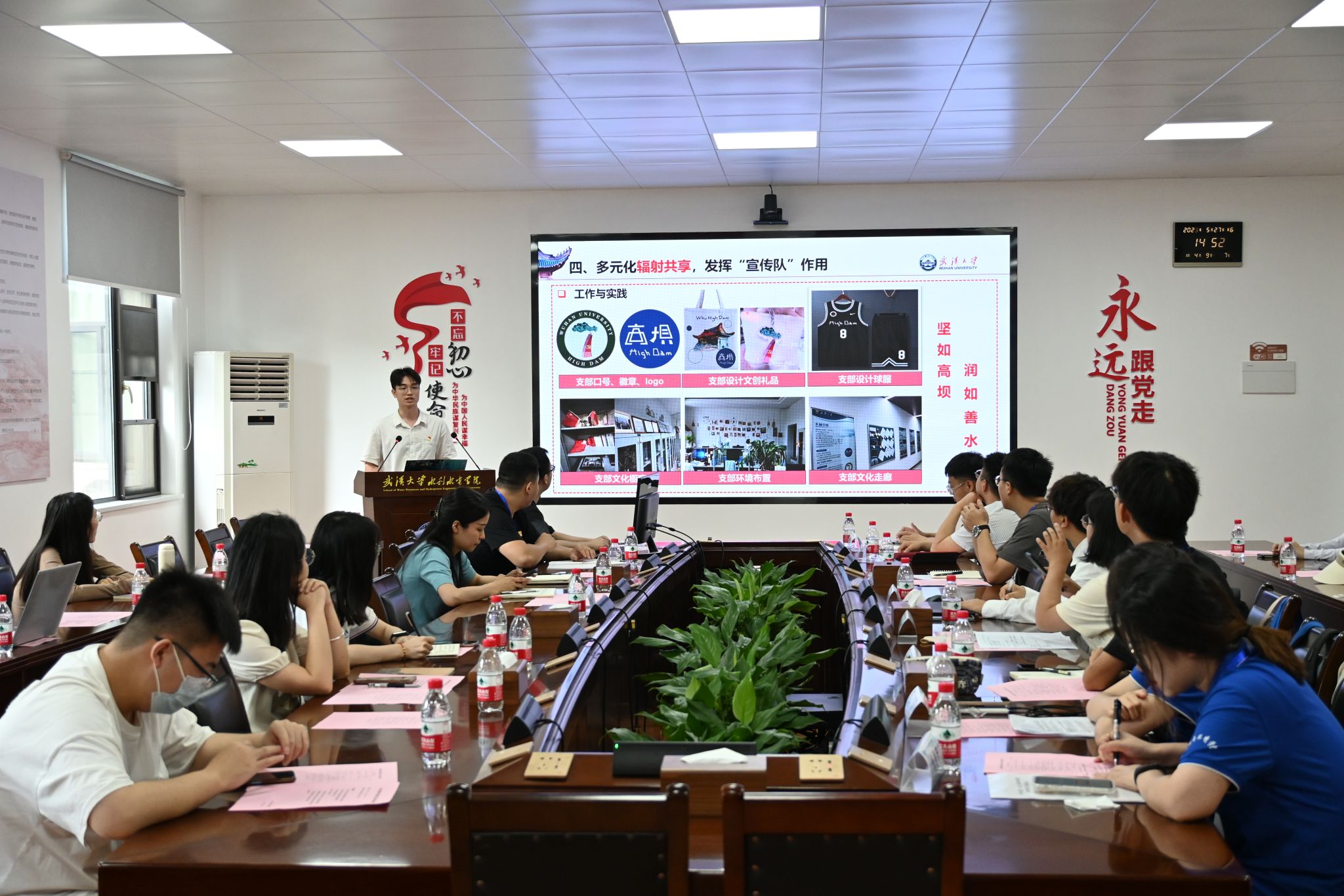 三峡大学水利与环境学院研究生第三党支部王宇同志做“党建引领促发展,兴水报国谱新篇”的学生党建工作综述,从“党建引领,团建赋能,凝聚青年力量”,“党建引领学科发展,厚植专业优势”,“党建引领队伍建设以质为先育人才”,“党建引领社会服务,同心聚力办实事”四个方面做党建工作汇报。他们依托水利工程、土木水利及工程管理学科底蕴和专业优势,以习近平生态文明思想为指引,以践行“长江大保护”为号召,落脚“长江大保护”国家战略发展需求,以扎根基层服务社会为特色,以支部一流党建助力学院一流学科发展,强化基层党支部引领作用。