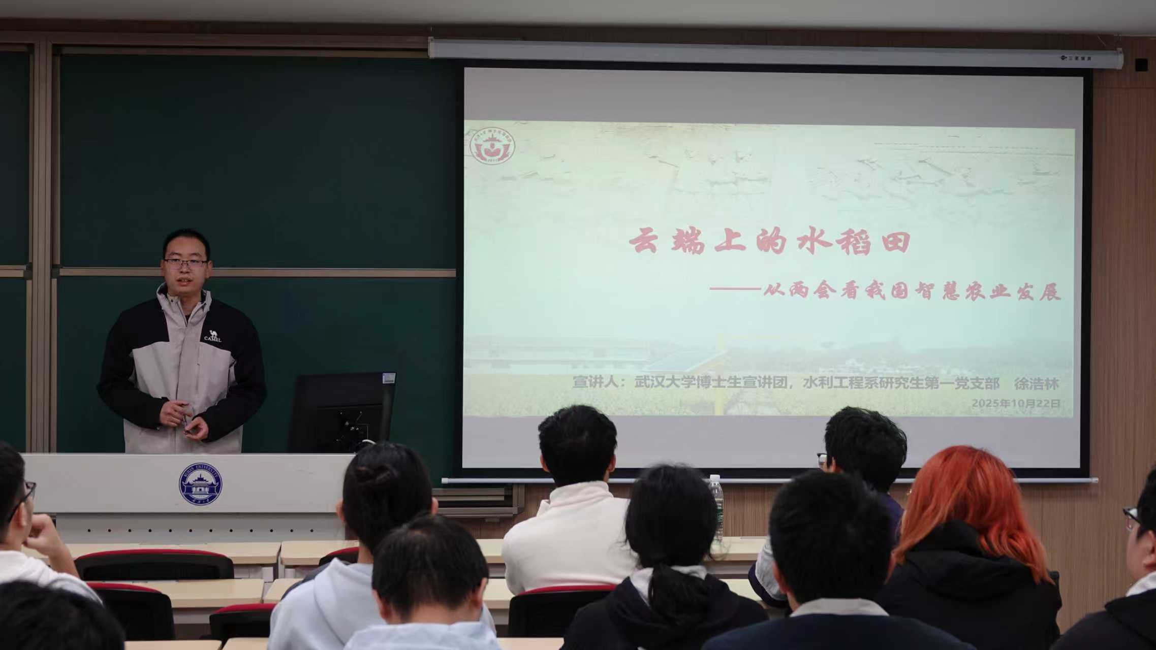 水利工程系研究生第一党支部书记徐浩林为支部成员开展专题理论宣讲。徐浩林同志以全国两会精神为主线,聚焦“高标准农田建设、农业强国、数字乡村”战略部署,系统解读了“藏粮于地、藏粮于技”在稻区水利现代化中的实践路径。