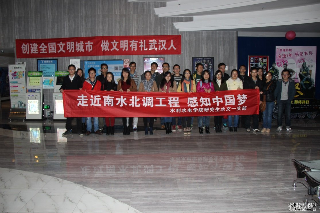 2014年11月24日中午,冒着淅沥沥的小雨和萧瑟的秋风,我院水文系第一党支部全体成员在支部书记刘章君同志的带领下前往中南路金逸国际影城,一起走进电影院,在南水北调中线工程即将通水之际,观看了这部有着水利版《建党伟业》之称的主旋律电影《天河》。本次活动是水文系第一党支部“走进南水北调工程,感知中国梦”主题党日系列活动的第一个版块。研究生党总支委员高启栋同志受邀参加了本次活动。