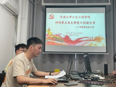 东南大学土木工程学院结构第五党支部许植胤同志从学院的成立故事出发,带领与会同志一览支部特色党建活动,如庐山红色历史遗址研学、东南大学-江苏元辰安装集团校企共建等,以“五彩”特色党建活动“点亮”党建工作品牌。