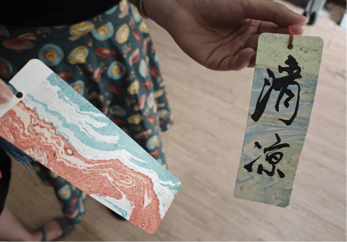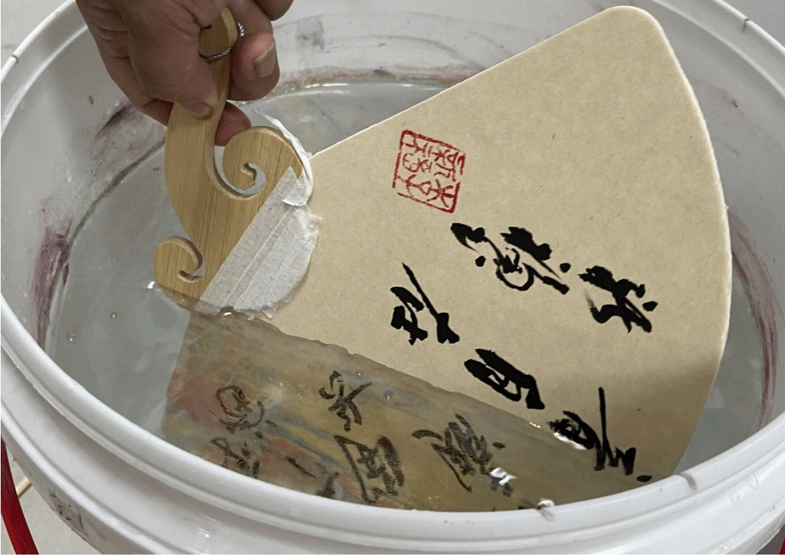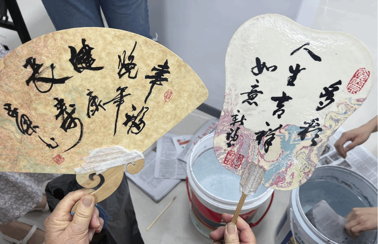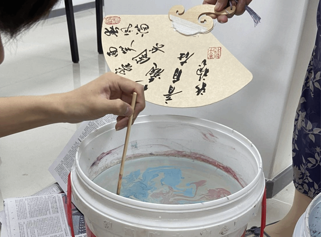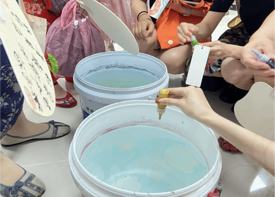 活动现场,居民们热情高涨,纷纷投入到漆扇的手工制作中。在漆扇制作区域,居民们,选好大漆颜色滴入水中,手持白色扇子,小心翼翼地将其放入漆桶中,通过垂直、旋转、Z字形等多种方式,运用彩漆在扇面上进行晕染,每一个步骤大家都认真细致地完成,创造出了一幅幅色彩斑斓、具有深厚文化底蕴的作品。每一把扇子都承载着制作者的奇妙构思和对传统文化的热爱。