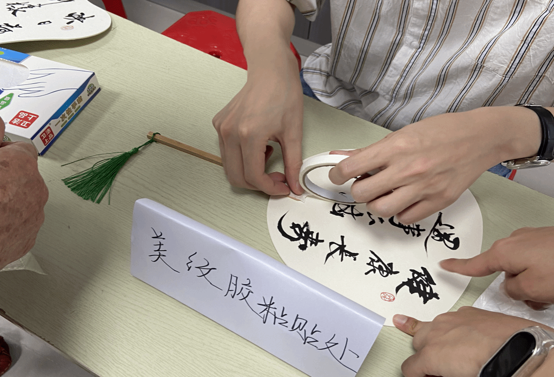 接下来,大家纷纷动手开始制作漆扇。在党支部成员的引导下,先用胶带粘住扇柄,避免扇柄被晕染上彩漆,影响扇面的美观性。