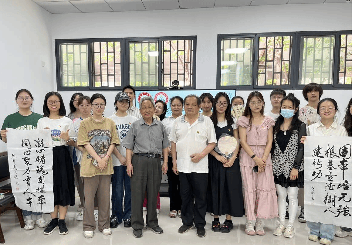 退休教授李新福和吕梁教授为大家在扇面上题字。大家有序排队,纷纷在纸扇上写下自己的寄语。