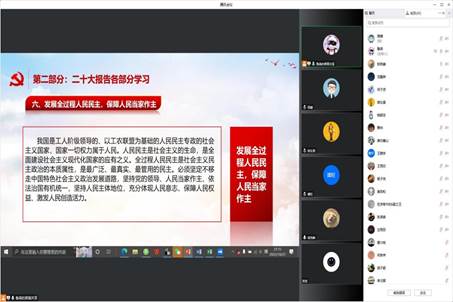 会议第二项,鲁燕同志从二十大报告的主题,二十大报告的内容、学习总结三个方面带领大家进行学习。党的十八大以来,中国特色社会主义进入新时代,党团结带领全国各族人民开辟马克思主义中国化时代化新境界,党的二十大明确了未来一个时期党的中心任务,指出要以中国式现代化全面推进中华民族伟大复兴。除此之外,鲁燕同志还从绿色发展,人民幸福和国家安全等多个角度做了详实的介绍。
