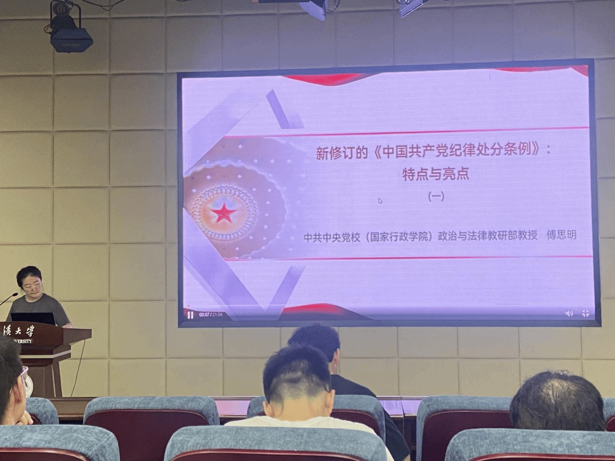 会议第一项,王新惠同志组织大家集体观看新修订的《中国共产党纪律处分条例》的特色与亮点视频。本讲由中共中央党校(国家行政学院)政治与法律教研部傅思明教授主讲,强调广大党员要增强“四个意识”、坚定“四个自信”、做到“两个维护”,党员同志要从知行合一的角度审视自己、要求自己、检查自己。观看视频结束后,支部成员纷纷表示将严守政治纪律和政治规则,始终在政治立场、政治方向、政治原则、政治道路上同党中央保持高度一致。