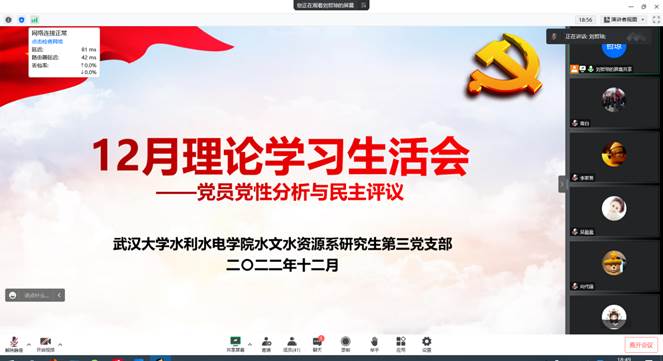 2022年12月22日,水文水资源系研究生第三党支部全体成员于线上召开十二月组织生活会暨党员党性分析与民主评议会。本次会议主要分为两项内容:一、全体支部成员深切悼念江泽民同志;二、党员党性分析与民主评议会。