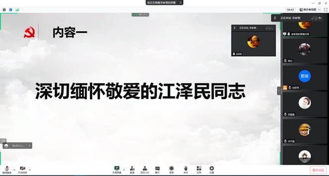 会议第一项,由李家誉同志带领我们深切缅怀江泽民同志。首先,李家誉同志表达了对于江泽民同志去世的悲痛心情,他详细介绍了江泽民同志伟大光辉的一生,并号召大家要继承江泽民同志的遗志。与会同志们都表示中华民族的伟大复兴事业,凝结了包括江泽民同志在内的一代又一代共产党人的心血与奋斗,我们也会化悲痛为力量,为社会主义现代化建设贡献力量。
