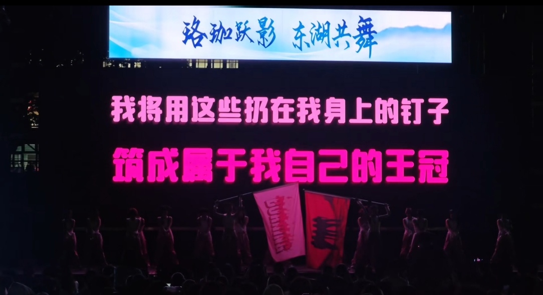 第一次接触这个舞种,最开始看见群里选出来的舞蹈视频我就只想到了两个字——退出。刚开始一周六练,眼花缭乱的动作和队形让我只想到了两个字——退出。晚上回去摸黑洗漱还会吵到室友也让我再三想到那两个字。但有时候缺乏执行力也能做成一些事情。我想着退出却总没下定决心说出口。渐渐的,舞蹈动作学完了,队形明晰了,我也想不起来最开始想到的那两个字。只想上台,很想参赛。