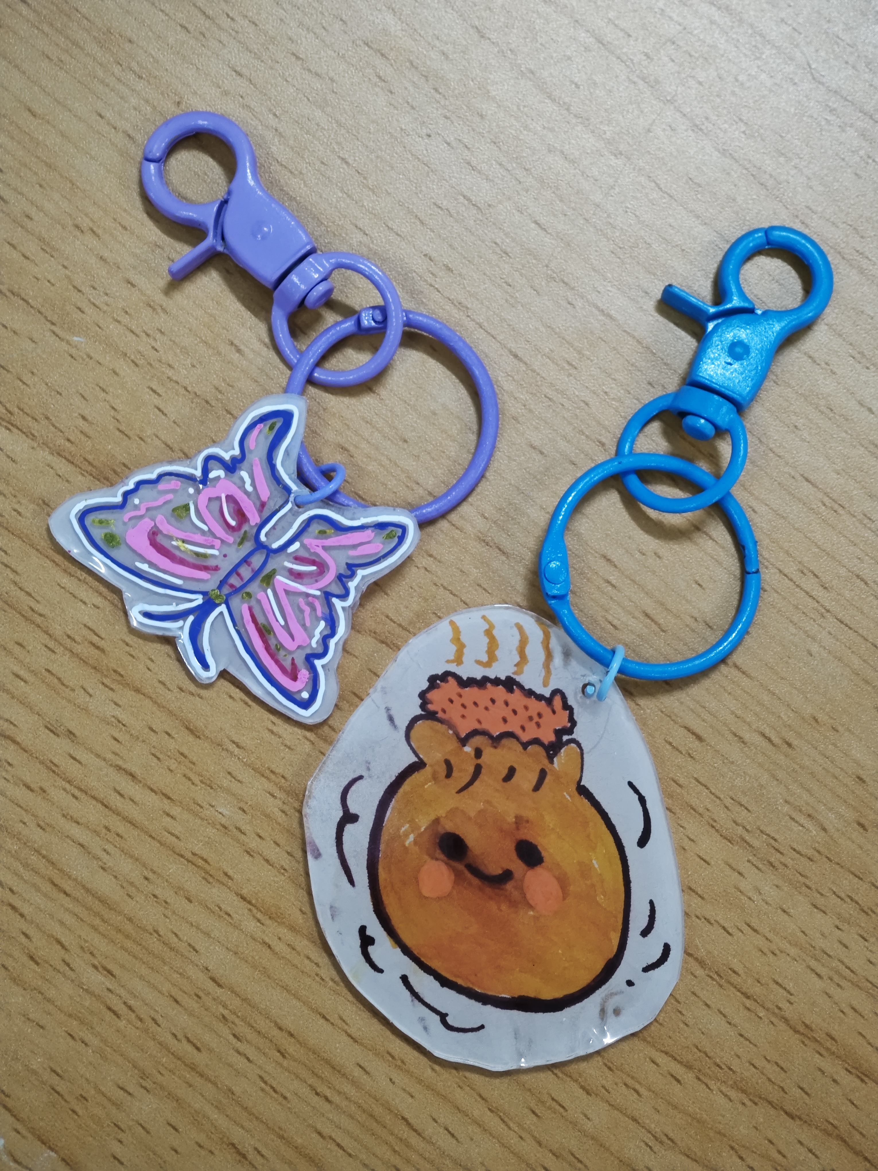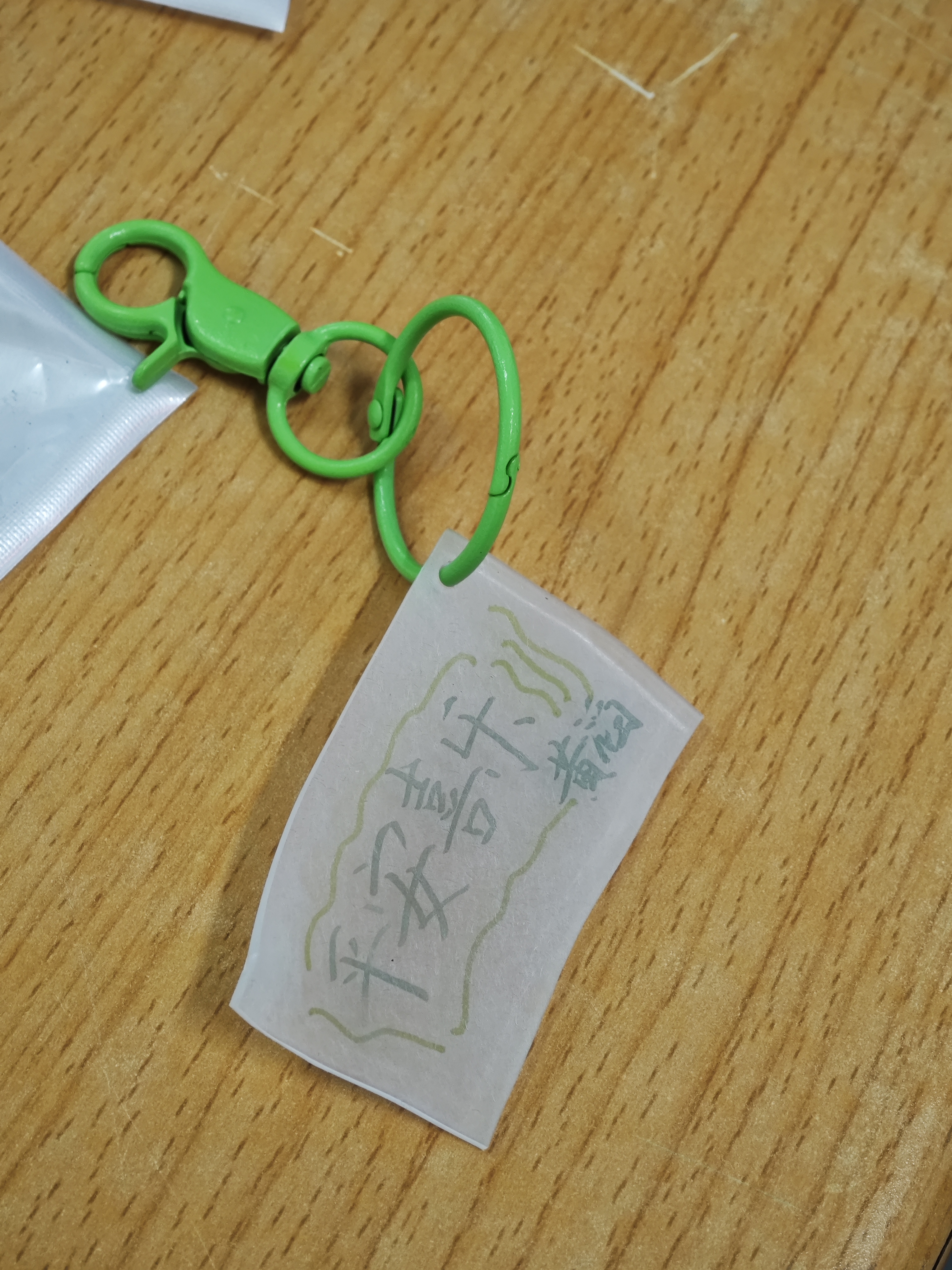 第三环节是充满疗愈感的手工热缩片钥匙扣制作。同学们在空白的胶片上挥洒创意,用颜料写下真挚的祝福或绘制心仪的图案。“禁止蕉绿”、“平安喜乐”、“实验顺利”等充满生活气息的祝愿语跃然其上,也有同学选择了可爱的简笔画或钟爱的歌词片段。随着热风枪吹出暖风,大家好奇而专注地看着自己亲手绘制的图案渐渐收缩、变硬、定型,最终成为一件件承载着个人心意与祝福的独特饰品。亲手制作的过程本身,就是一种专注的放松和积极的自我表达。“感觉整个过程很放松有趣,也认识了一些其他学院的朋友,非常期待下一期的活动。”来自土木建筑工程学院的一位同学道出了大家的心声。