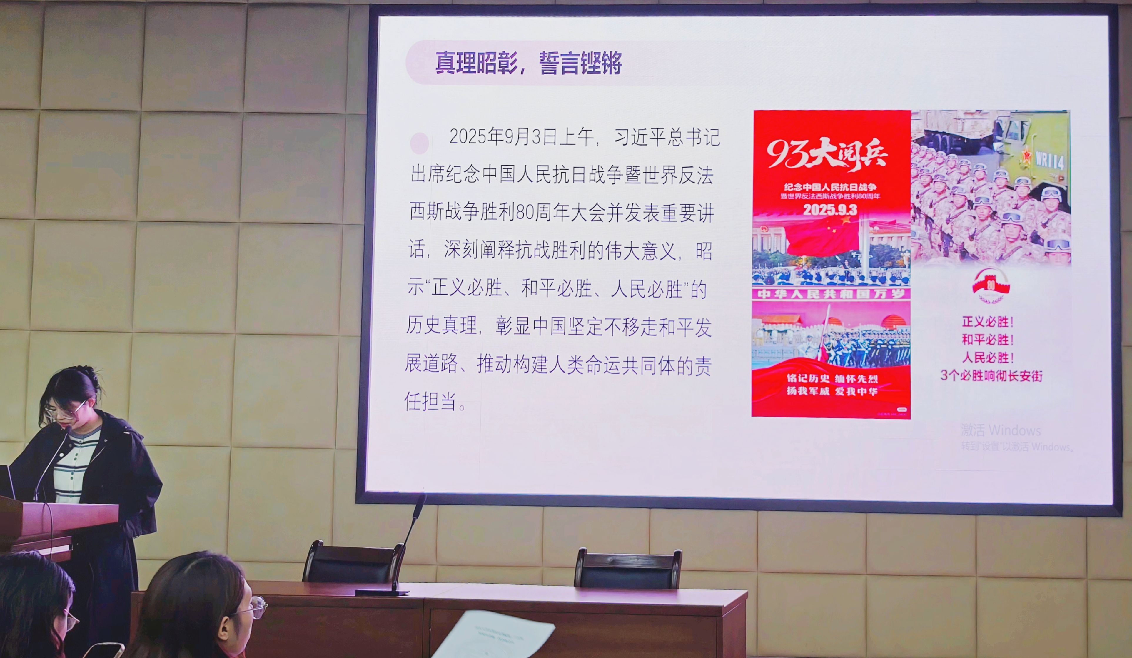 会议伊始,办公室成员余祎璐同学开展思想引领工作,带领全体成员进行了专题思想学习,深入领学了“习近平总书记在纪念中国人民抗日战争暨世界反法西斯战争胜利80周年大会上的重要讲话精神”。她系统梳理了讲话的核心内容,并结合新时代青年的责任与使命,对讲话精神作了深刻阐释,引导同学们从伟大抗战精神中汲取奋进力量。