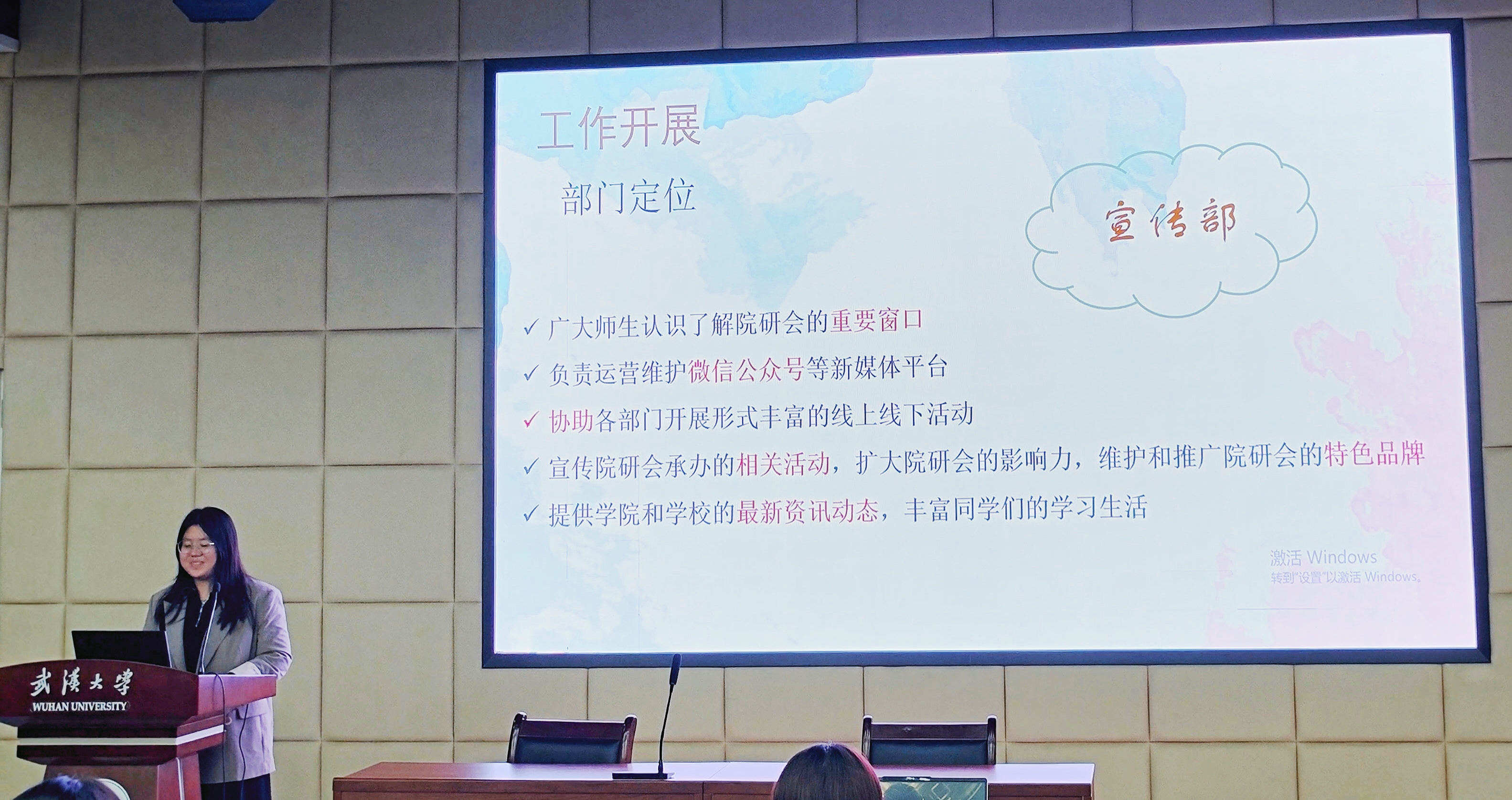在随后的部门展示环节,主席团成员王慧、王博宇、夏可成、魏含津四位同学依次登台,围绕部门特色、工作成果与未来规划三个方面,对所辖部门作了系统介绍。展示内容充实、亮点纷呈,充分展现了办公室、宣传部等六个部门各具特色的工作风貌与锐意进取的团队活力,也进一步勾勒出新一届研会团结协作、奋发有为的整体形象。