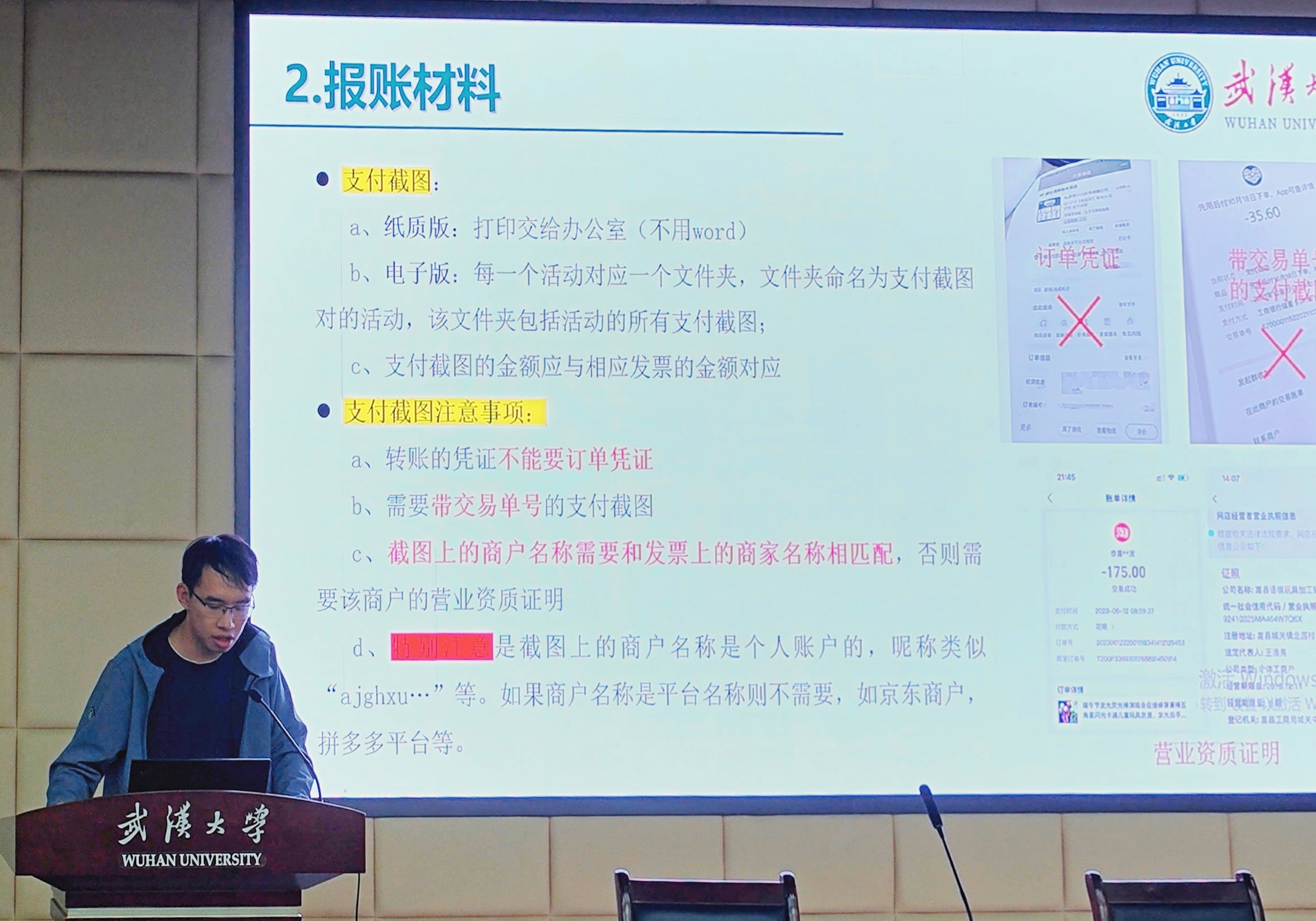 研究生会报账说明及注意事项”开展了专题培训。他详细讲解了物品采购、发票规范、支付凭证及材料提交等关键环节的具体要求,并辅以典型错误案例进行对比分析,有效巩固了同学们的实务知识,为后续工作的规范化运行奠定了坚实基础。