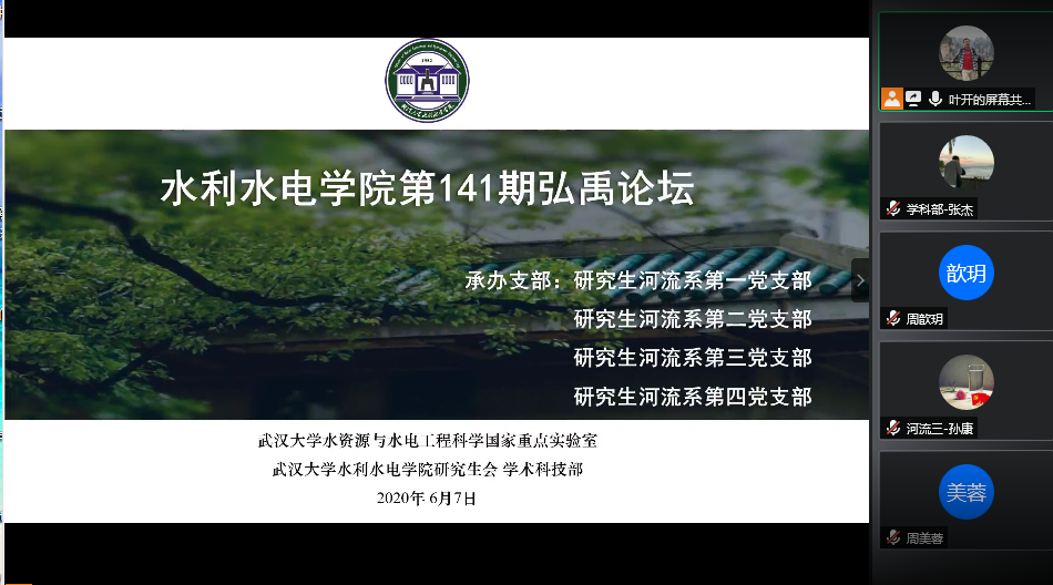 6月7日下午,学院第141期研究生“弘禹论坛”在腾讯会议app举行。教师张小峰、曾玉红、邓金运和李志威,研究生辅导员左志香,学生主讲人倪玉芳、刘长杰、杨卓媛及相关专业研究生代表出席。本次论坛由研究生河流系第一党支部、研究生河流系第二党支部、研究生河流系第三党支部和研究生河流系第四党支部联合承办。