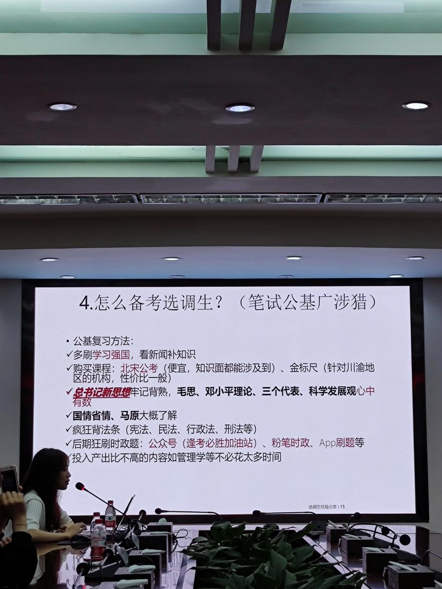 黄栩一师姐,已录用为四川省成都市急需紧缺专业选调生,从她自身的备考经验出发,详细讲解了自己从去年十月开始的备考期间遇到的各种问题。黄师姐还向大家介绍了她考试期间利用的资源,关于选调和人才引进政策的相关公众号,全面叙述了笔试中行测、申论、公基的答题技巧还有面试中同学们在话术、着装方面考虑的问题,覆盖内容十分全面且满满的干货让同学们感到不虚此行。