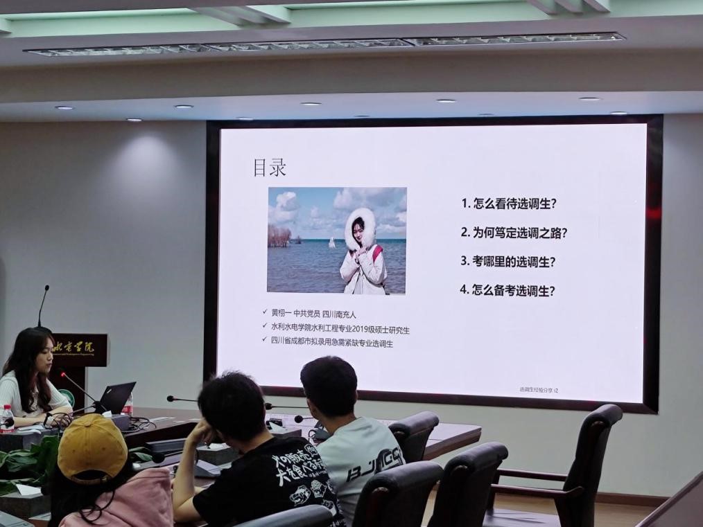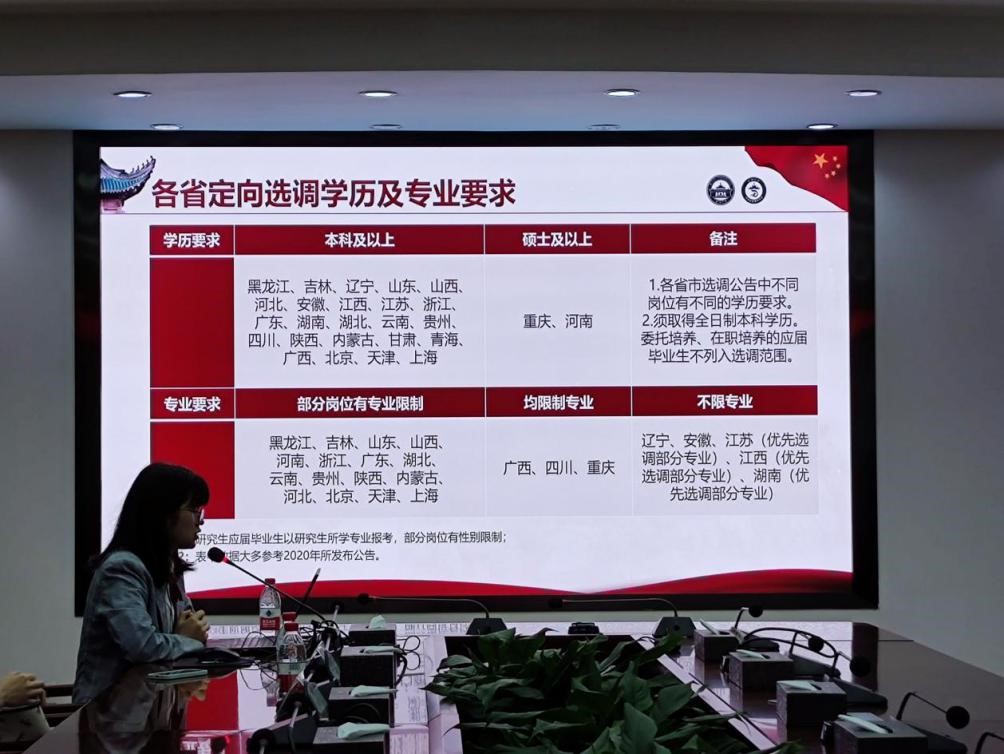 姚彩娣同学从四个方面展开讲解了选调生的各项政策,详细介绍了各省选调生的培养与分配以及我校毕业选调生在各省市的分布情况,姚同学还特别介绍了四川省的选调生录取条件并为在场同学们详细解读了四川省选调生录取招聘公告,获得同学们的一致掌声。最后姚同学介绍了选研会的后续活动,提供了选研会的官方联系方式。
