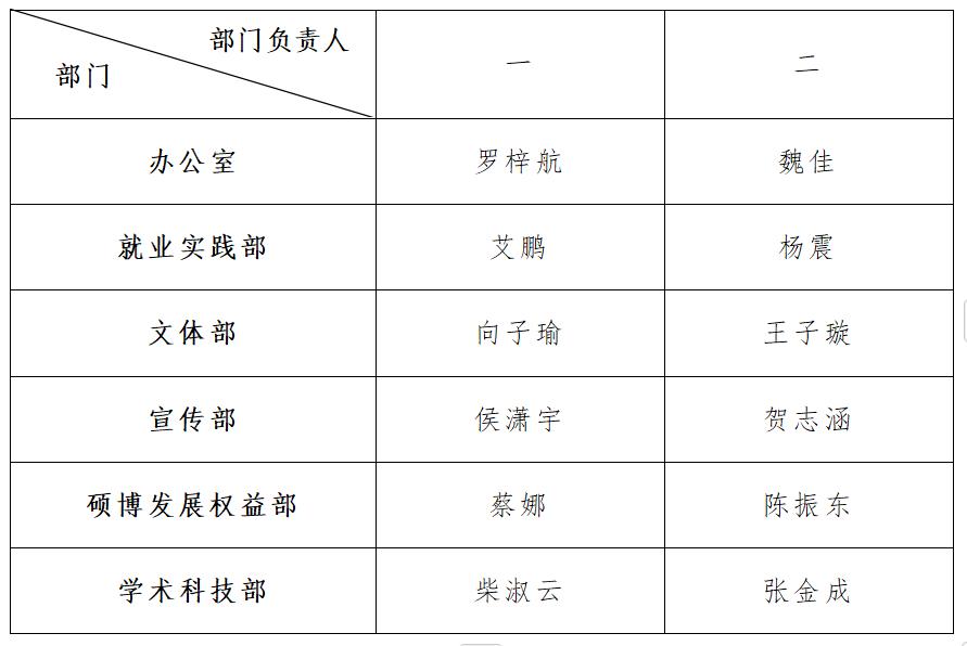 第二十四届研究生会于2024年12月19日完成了研究生会各部门负责人选拔,经同学自愿报名、面试,由主席团讨论商定选出第二十四届研究生会各部门负责人,并于12月23日完成研究生会工作人员补招工作。现将任职情况一并公示如下: