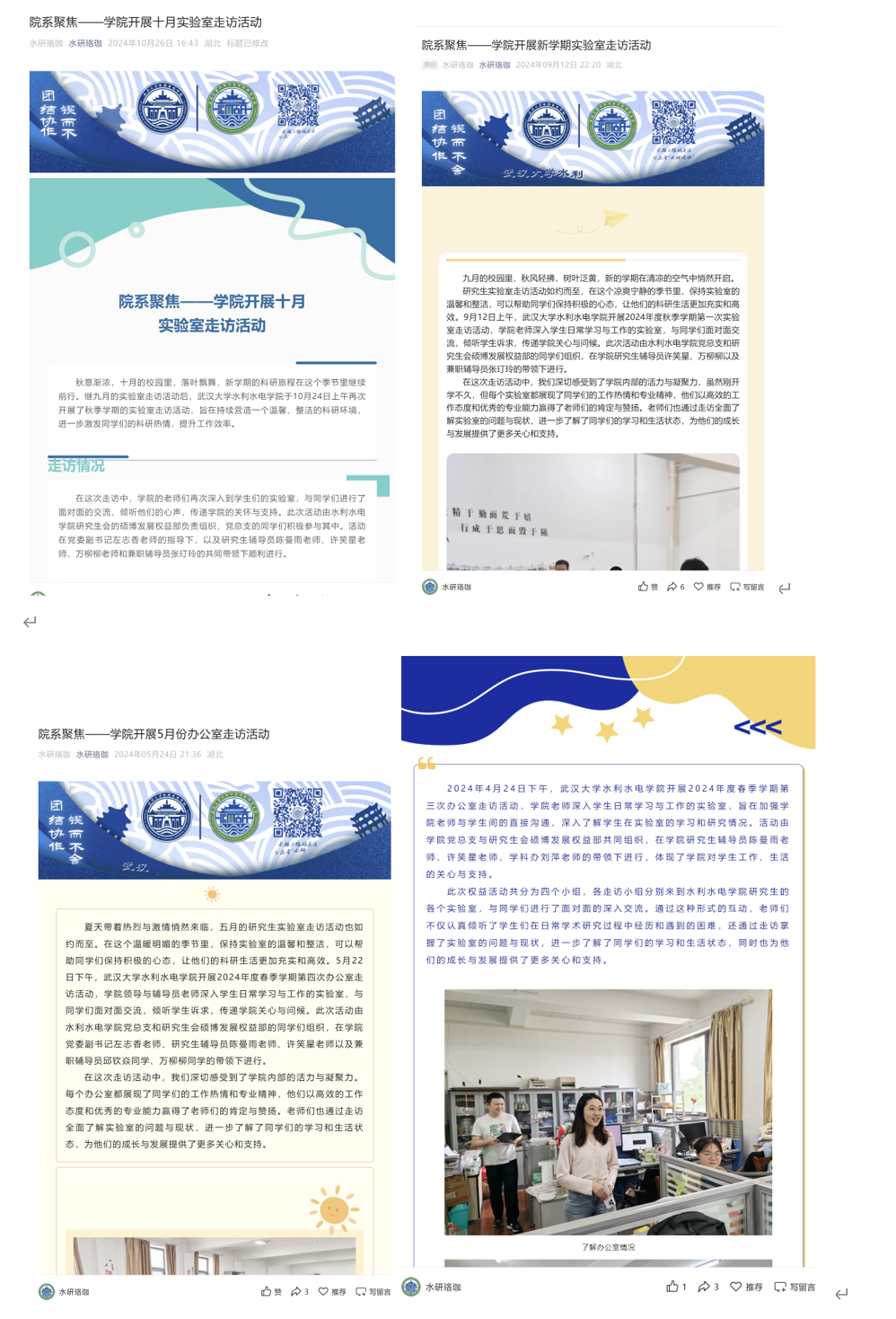 收集并解决权益问题 128项。 向院内同学发送权益通知80余条 转发校领导接待学生日活动、职能部门与学生面对面活动及与同学们 生活权益相关的调研会、座谈会信息9余次 向校研究生会反馈权益问题11次 |