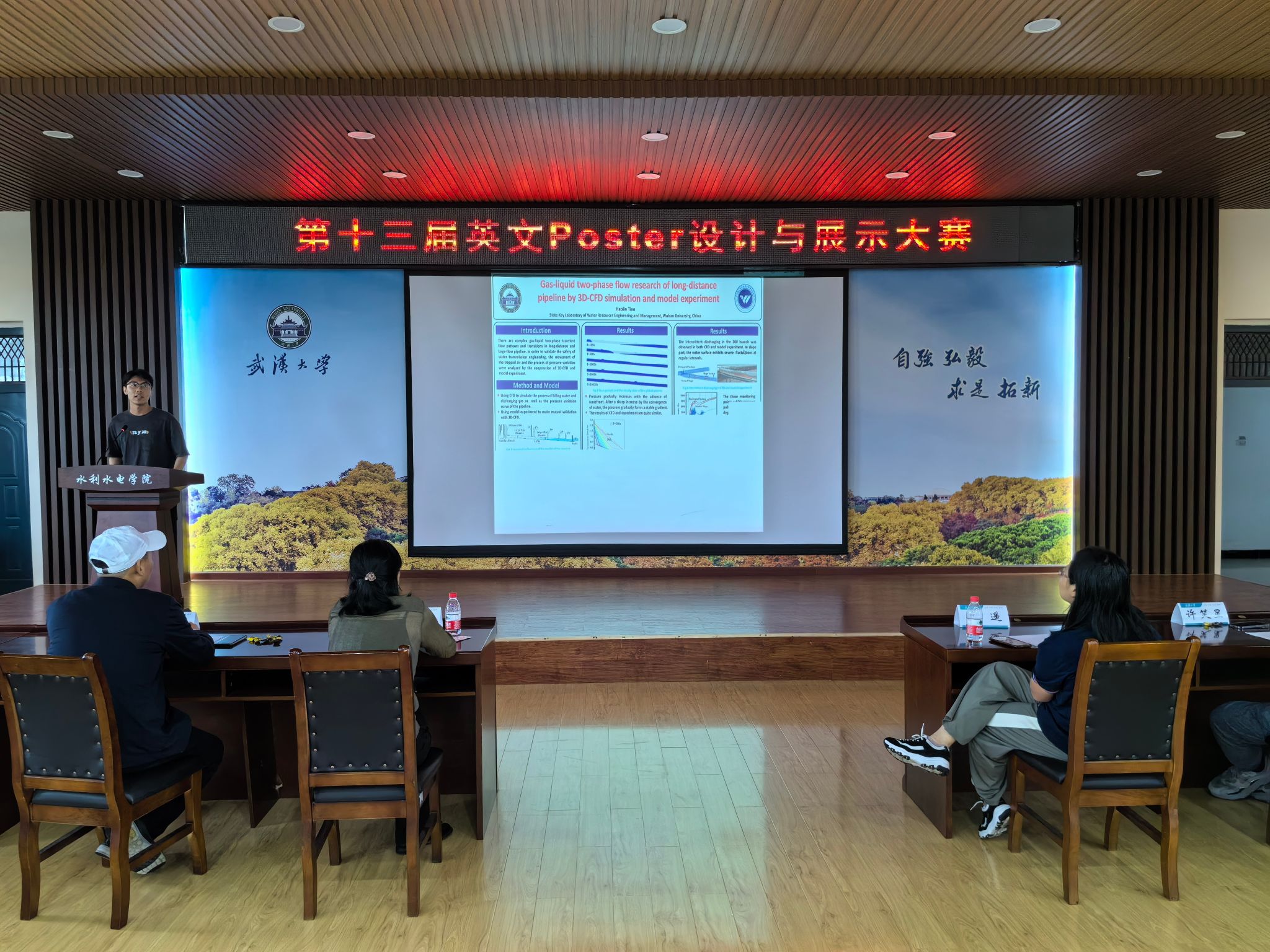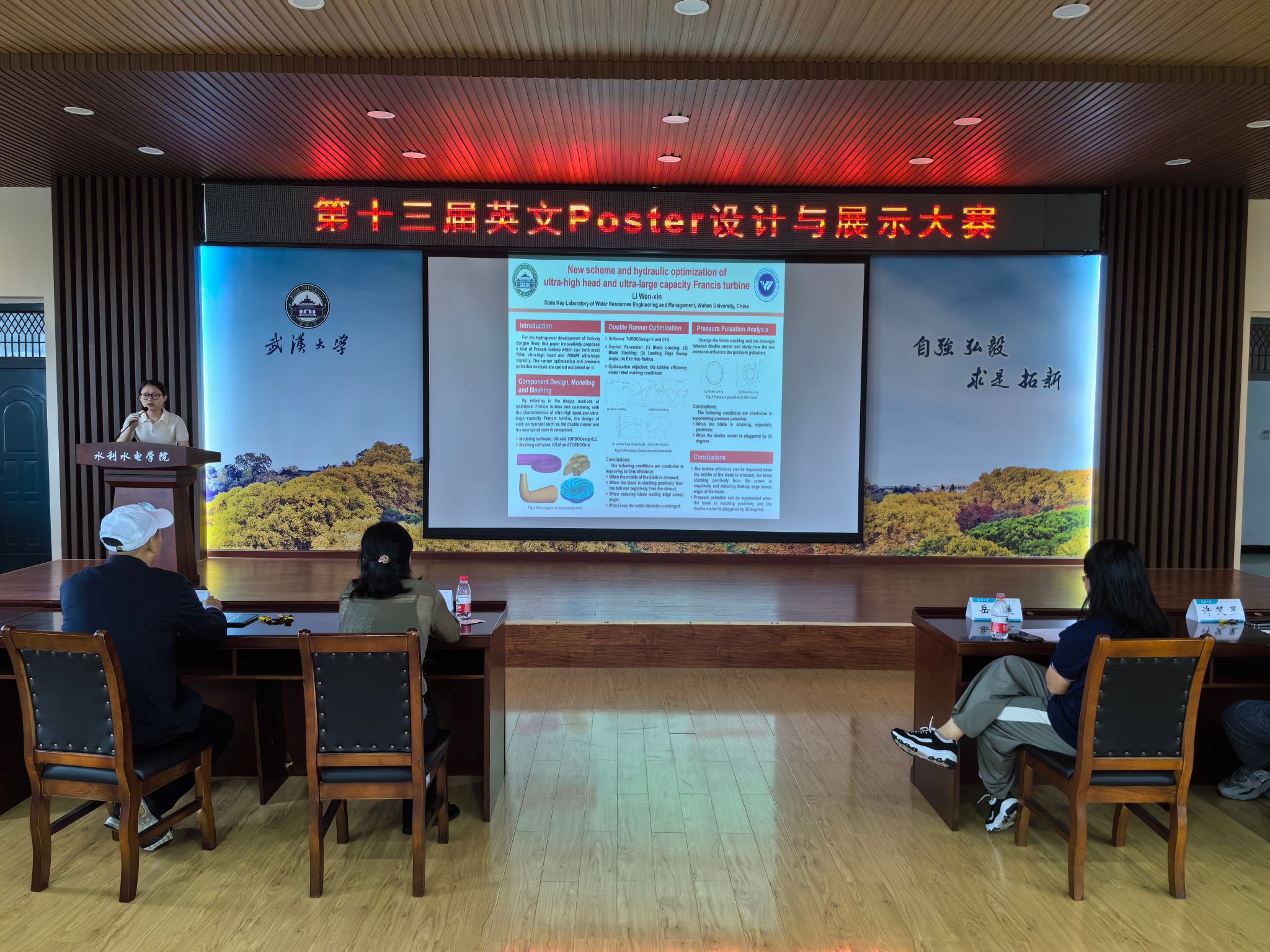 与时偕行,弘毅自强;弘扬学术,凝聚力量!2024年4月28日14:00,由IAHR91黑料 学生分会、91黑料 研究生会和91黑料 土木建筑工程学院研究生会联合举办的第13届英文Poster设计与展示大赛在工学部八教8328会场举行。出席本次决赛的嘉宾有程永光老师,曾玉红老师,岳遥老师以及研究生辅导员许笑星老师。